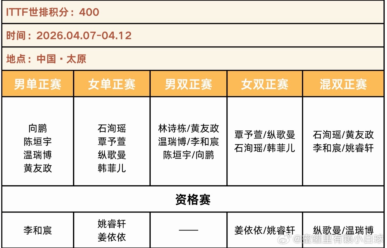 太原常规挑战赛国乒双打名单精彩看点:林诗栋、黄友政男双~陈垣宇、向鹏男双~黄友政、石洵瑶混双~