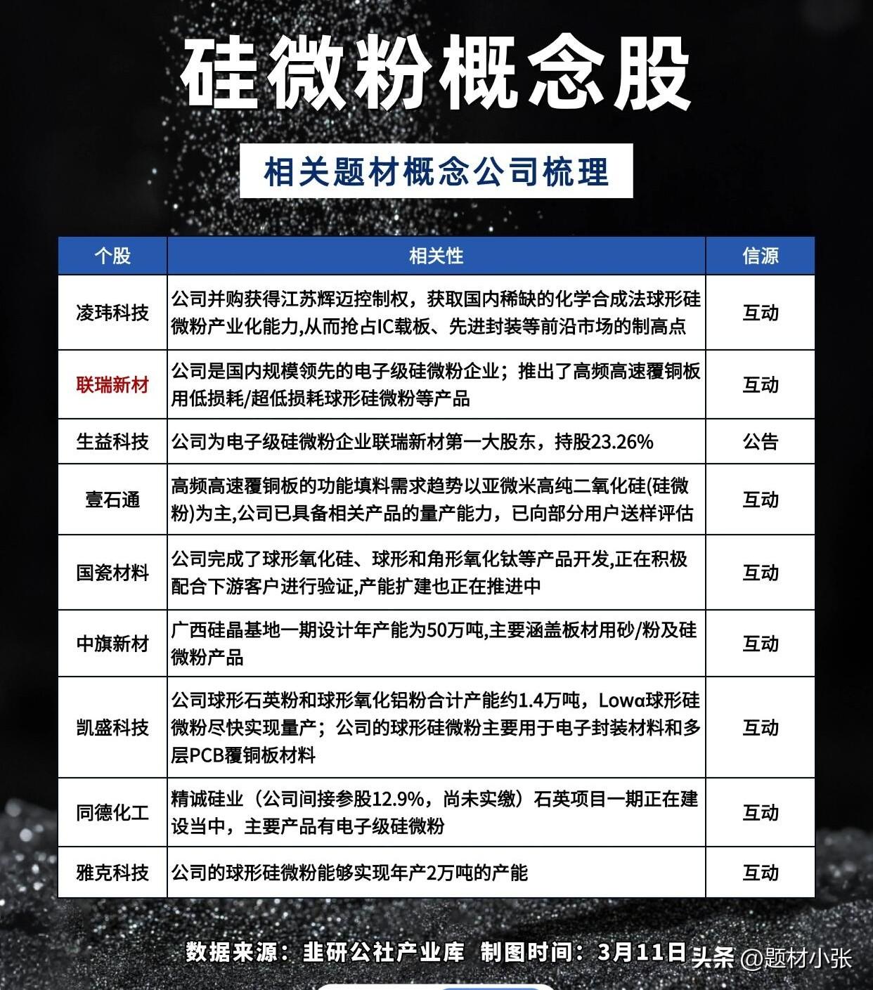 硅微粉概念股梳理! AI服务器与先进封装需求爆发,高端球形硅微粉成核心刚需!联瑞新材、雅克科技等企业卡位国产替代,M9级覆铜板与半导体封装赛道景气度持续攀升,把握产业升级机遇。 风险提示:本表仅为静态梳理,不构成投资建议,股市有风险,入市需谨慎。