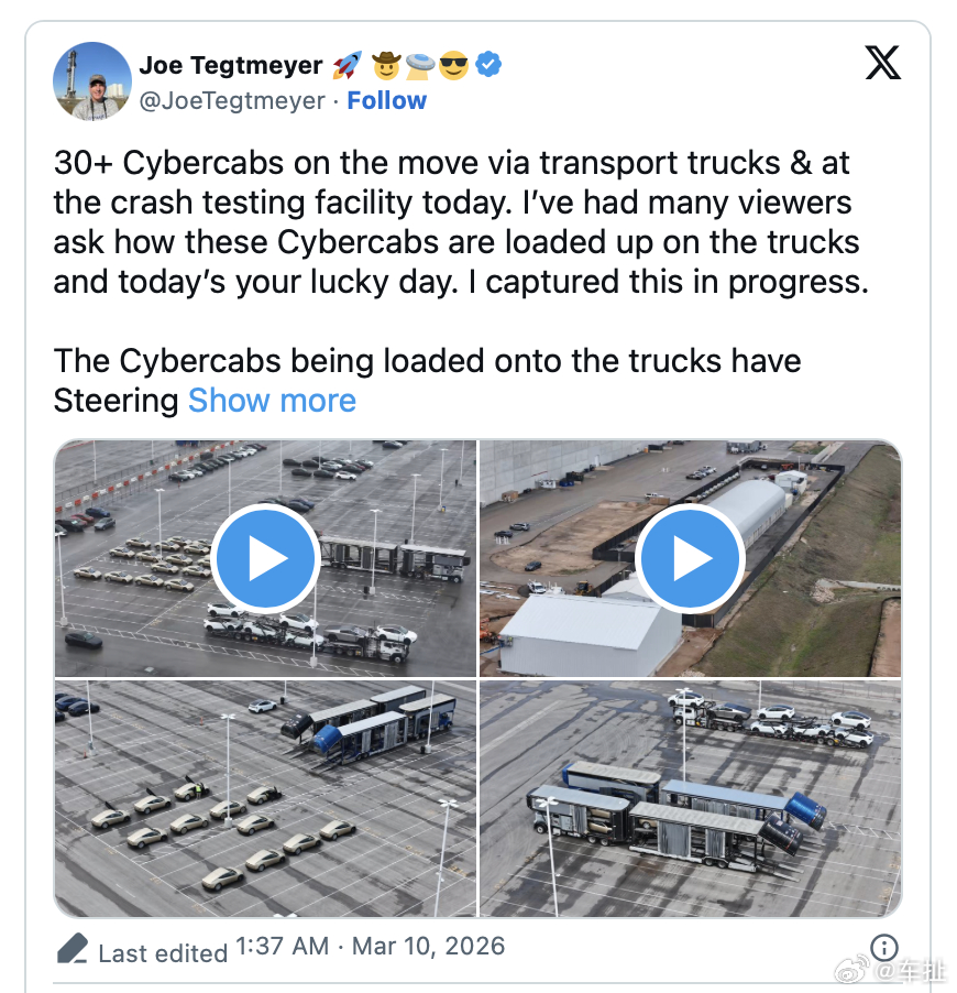 随着特斯拉准备扩大其Robotaxi车队,这些车辆可能会被运往美国各地的测试地点。在德州超级工厂拍摄的其他视频还显示,在车辆装载到运输卡车时,Cybercab的侧视和后视摄像头清洗系统正在运行。