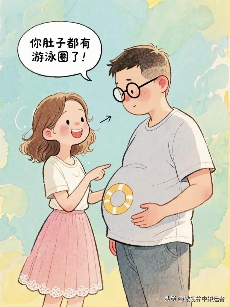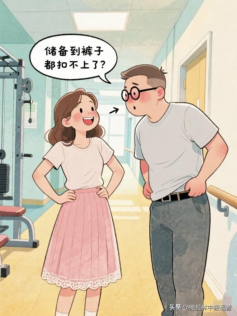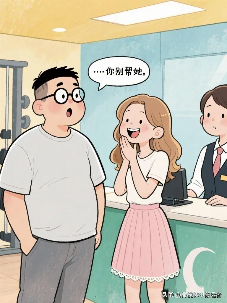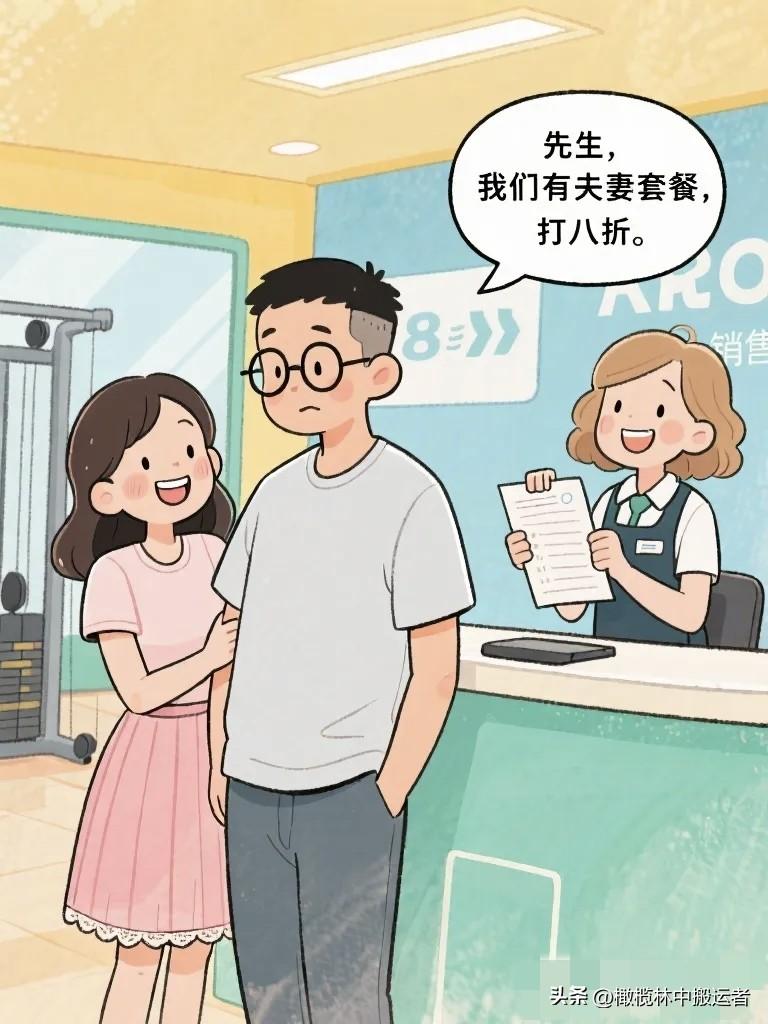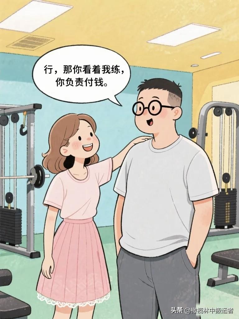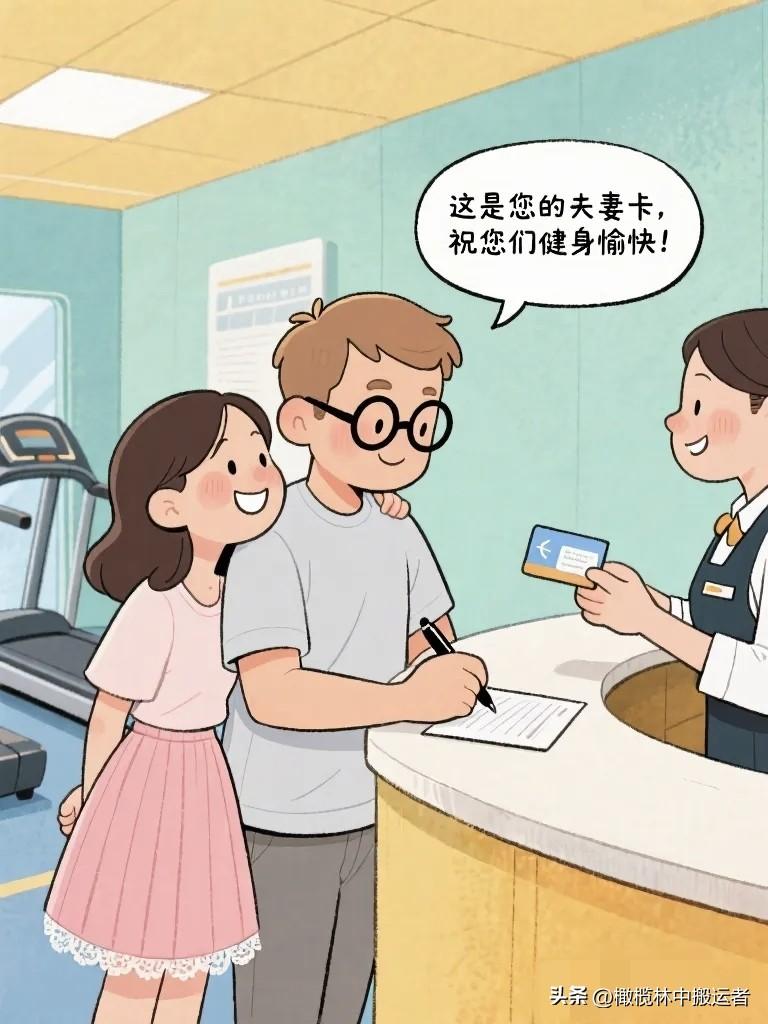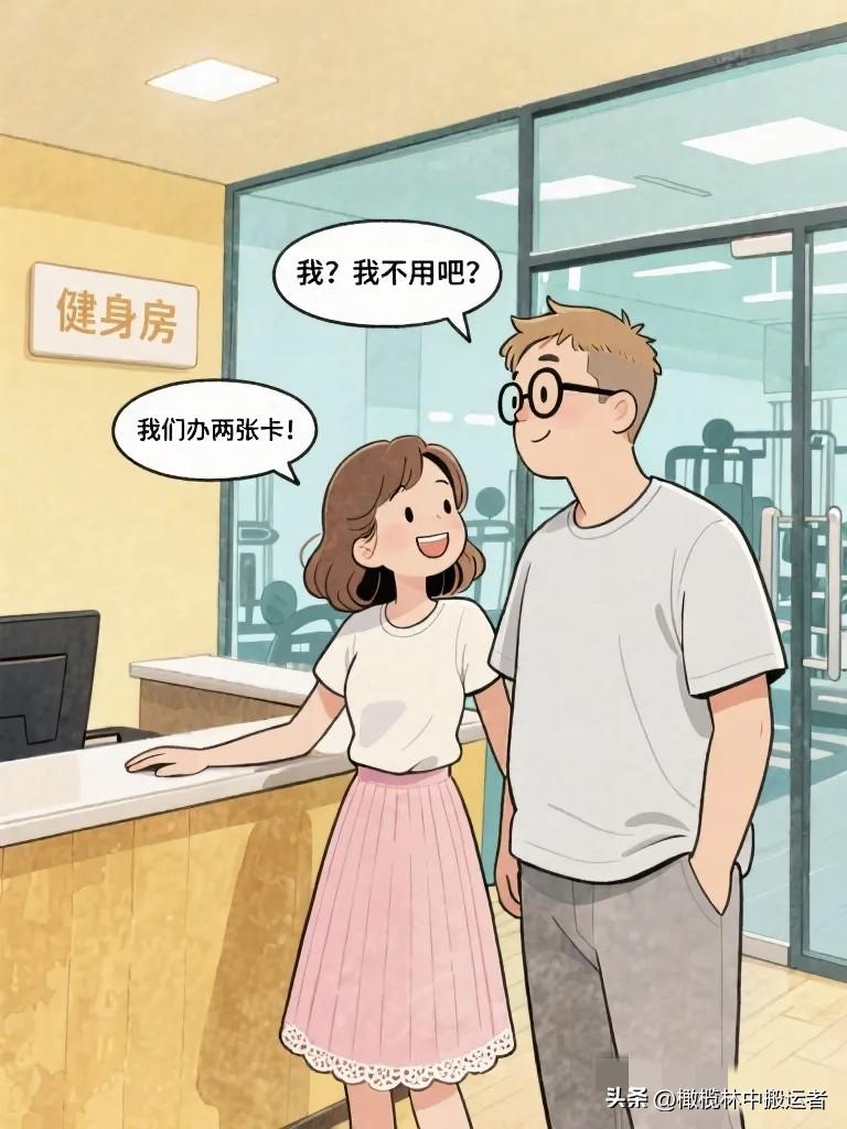 搞笑漫画:夫妻站在健身房前台, 妻子:"我们办两张卡!" 丈夫:"我不用吧?" 妻子:"你肚子都有游泳圈了。" 丈夫……