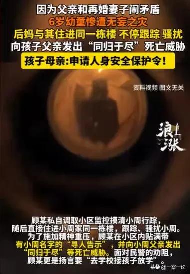 上海,女子和离异男结婚,却感情不和,闹矛盾,她就迁怒于离异男的孩子,孩子才6岁,跟着他的母亲生活,女子不但跟踪,骚扰孩子,还租了房子,和孩子同1栋楼,她向丈夫威胁道,要同归于尽。 顾某和丈夫又大吵一架,她的心情非常不好,丈夫是离了婚,再婚的,顾某一直以为,丈夫离过婚,会和她好好经营婚姻。 却没有想到,丈夫离过一次婚,再婚了依然不懂得好好地疼她,爱她,顾某越想心里越不平衡,她把这一切都归咎于丈夫和前妻的孩子。 孩子才6岁,虽然孩子跟着母亲生活,可顾某依然觉得,正是因为有孩子的存在,影响了她和丈夫之间的感情,才导致他们感情不和,一直有矛盾。 丈夫如此对她,她一直怀恨在心,于是迁怒于孩子。 6岁的孩子,根本不知道父亲和继母之间的事情,无缘无故就遭受了这飞来横祸,自从继母和父亲闹矛盾,继母的一言一行,都成了他的噩梦。 顾某根本不顾孩子年纪小,自从她和丈夫闹了矛盾,她就开始跟踪6岁的孩子,她不单单是跟踪,她还骚扰孩子,做出一些让孩子害怕的事情。 孩子才6岁,他怎么会明白,继母为什么要这样对他,面对继母的跟踪,面对继母对他不停的骚扰,他只觉得心生害怕,看见继母就吃不好睡不好,他只想着继母能够消失在他的生活中,他只想和妈妈好好生活。 可是顾某哪里会放过这6岁的孩子,为了能够干涉孩子,拿孩子来威胁丈夫,她私自调取了小区的监控,摸清了孩子的行踪,知道孩子什么时候上下学,更知道孩子住在哪里。 于是为了更好地控制孩子,她就租了房子,她租的房子,正好和孩子住的房子是同一栋楼。 从此孩子的每一天都像噩梦一般,他始终摆脱不了继母对他的骚扰。 顾某更是向丈夫发出威胁,要与同归于尽。 顾某说出这样的话,又不停地跟踪骚扰孩子,孩子终于忍不住了,向母亲说出了自己的遭遇。 母亲这才意识到,孩子虽然跟她生活,却始终没有摆脱父亲和继母之间的事情。 甚至继母骚扰他,已经对他的生活,造成了严重的影响,孩子的继母还威胁,要同归于尽,这样的话让孩子的母亲感到毛骨悚然。 大人的事情怎么可以迁怒孩子呢,她和孩子的父亲已经离了婚,孩子又是跟着她生活,孩子对继母和父亲之间的感情,根本就没有影响,她也想不通孩子的继母,为何要揪着孩子不放。 他们之间的感情,他们私自解决就好了,难道跟踪骚扰孩子,就可以解决他们之间的感情了吗? 孩子的母亲看着孩子的继母如此危险,已经严重影响到了孩子的生活。 再这么下去,孩子的继母,会做出什么事情,孩子的母亲不敢想象。 孩子是她身上掉下来的肉,不该成为他父亲和继母之间可以随时迁怒的物品。 她要保护孩子,孩子才6岁,心智都没有成熟,继母所有的行为,都有可能成为他日后的心理阴影。 继母能够说出同归于尽的话,孩子的母亲已经能够想到,孩子的继母和孩子的父亲,感情有多么的糟糕,她更能感受到孩子的继母,是一个很危险的人,她的存在,不但影响孩子,或许有一天,她会伤害孩子。 作为孩子的母亲,她不容这样的事情发生,她要保护孩子。 可她带着孩子搬离原来住的地方,都无法逃脱孩子继母的跟踪和骚扰,她只好向法院申请人身保护令。 遇到这样的事情,她只能这样,她的孩子才6岁,正处心智发育关键时期,如果长期收到继母的威胁,孩子难以健康成长。 法院经过审查之后,也是签发了人身保护令,不允许顾某继续跟踪骚扰孩子,甚至不让她接近孩子,甚至在孩子周围的100米内,顾某都不可以做一些影响孩子的行为。 不管孩子的继母和父亲之间的感情如何,矛盾有多大,孩子都是无辜的,孩子没有过错,大人的事情就不应该迁怒于孩子。 遇到这样的事,其实继母的行为已经对孩子构成了威胁。 《治安管理处罚法》第42条规定:有威胁他人行为的,处五日以下拘留或者五百元以下罚款;情节较重的,处五日以上十日以下拘留,可以并处五百元以下罚款。 面对孩子继母的威胁,作为母亲,她当然可以申请人身安全保护令,保护自己的孩子。 那么你对这样的继母有何看法呢?记录我的2026