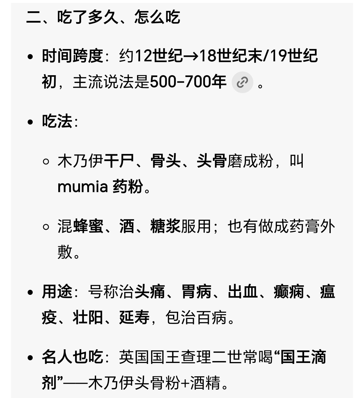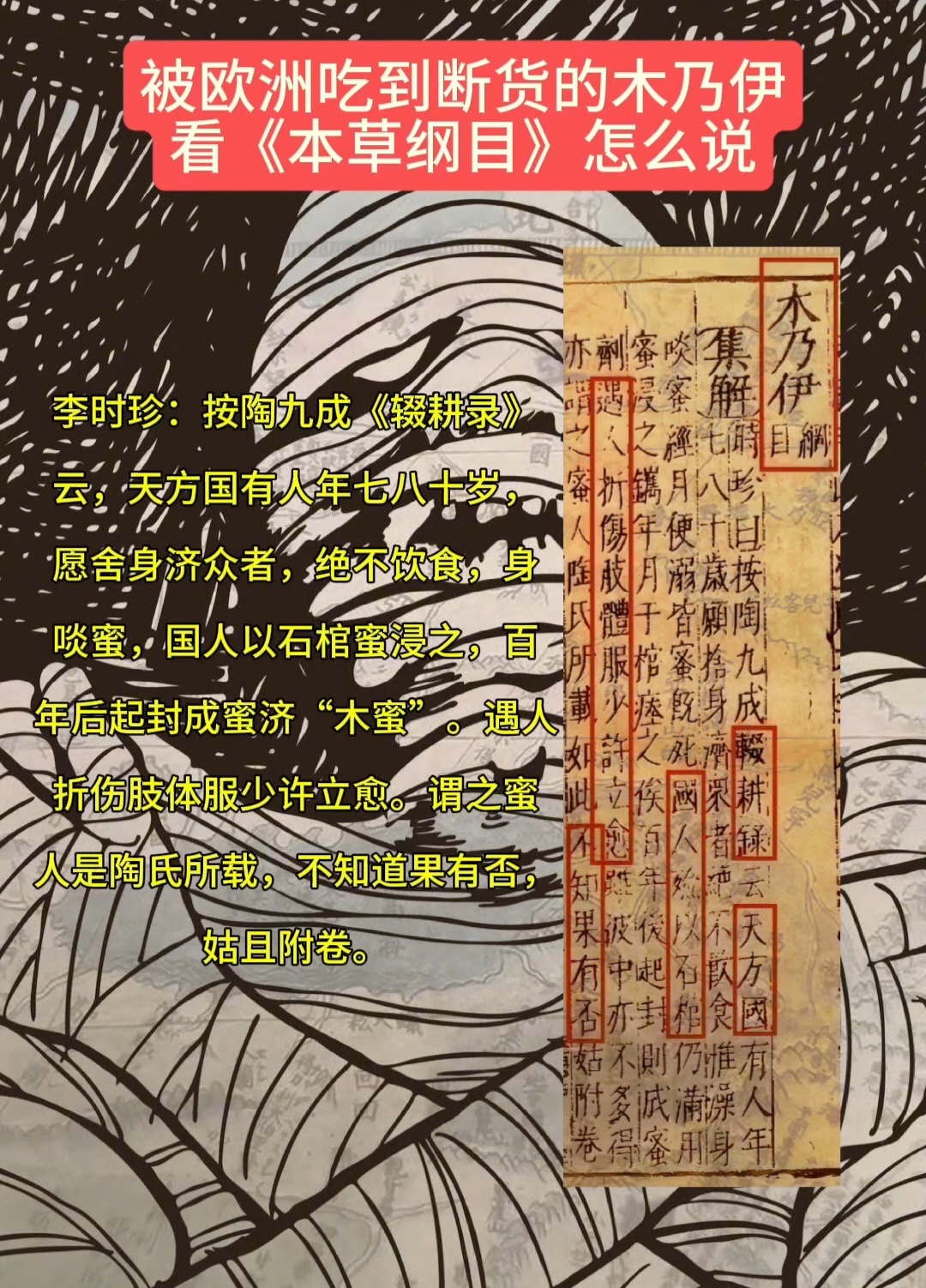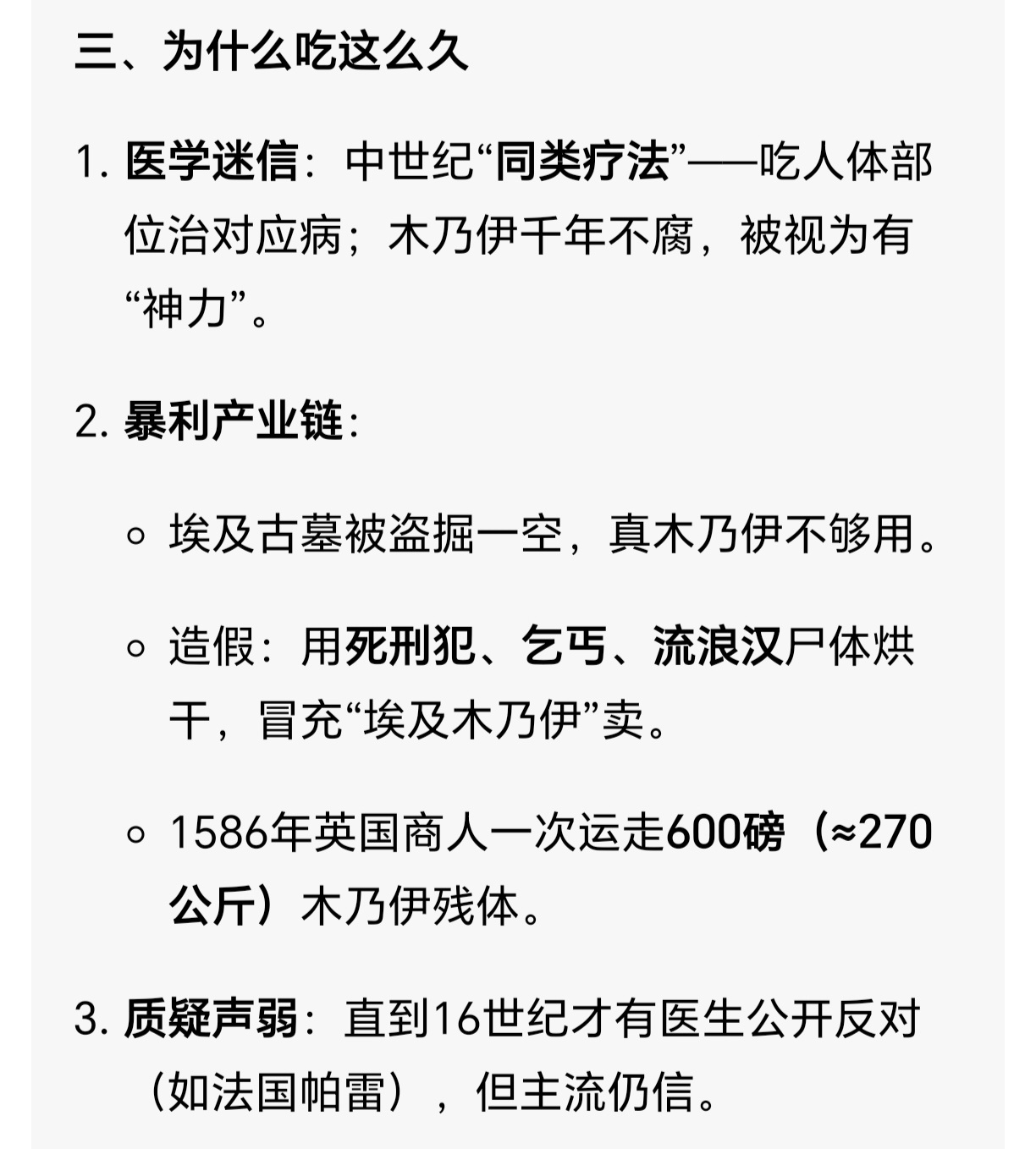 英国博物馆被曝藏超26万件人类遗骸这又让我想到了欧洲人吃木乃伊的历史,还吃了几百年,畅销欧洲,李时珍本草纲目就收录了天方国的“蜜人”制作法,再加上之前流传的“朊病毒基因检测”排行榜,让人毛骨悚然。