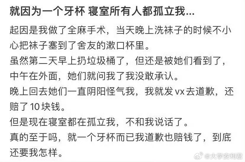 就因为一个牙杯 寝室所有人都孤立我...
