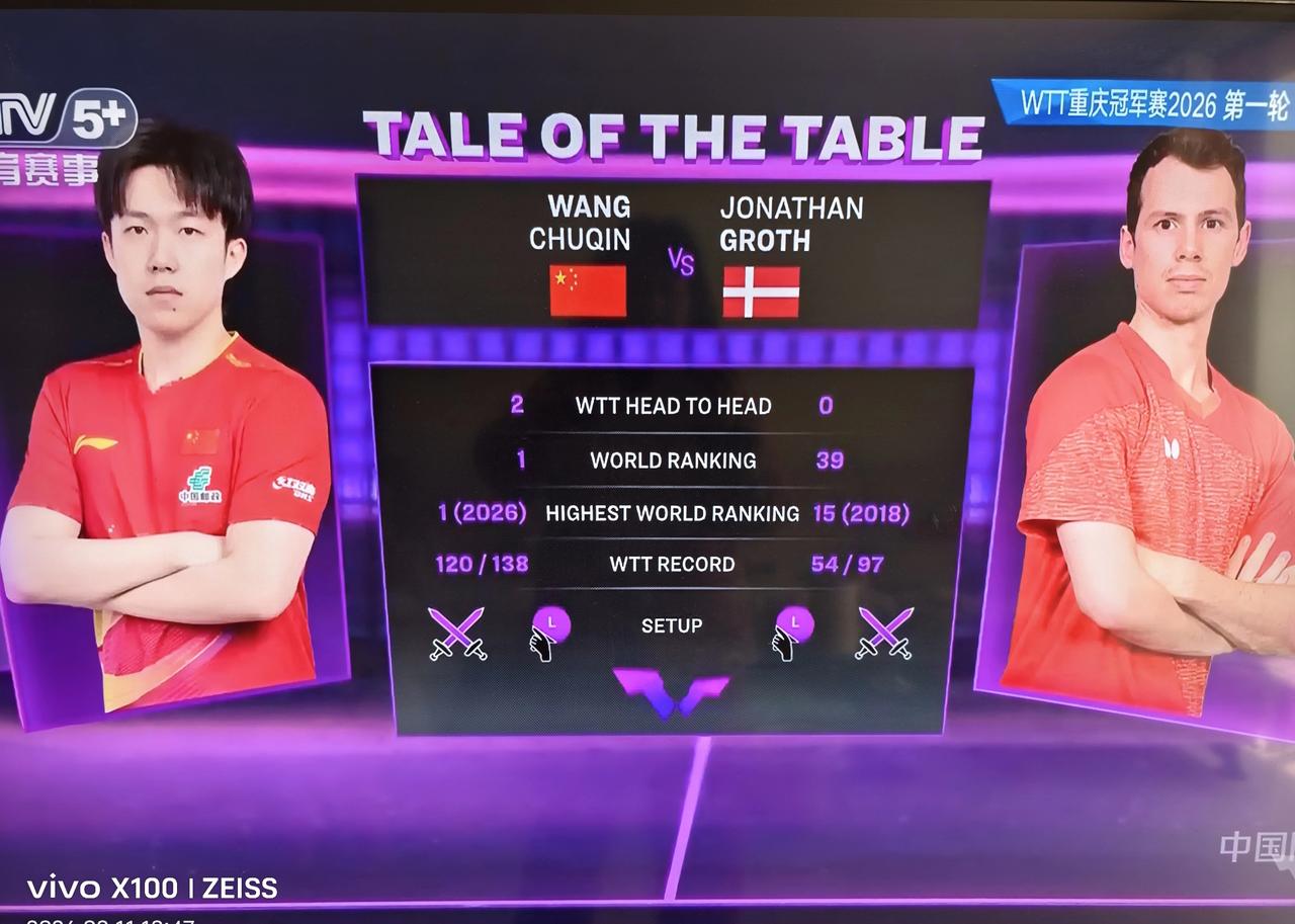 第一局王楚钦🇨🇳11-8先胜格罗特🇩🇰 ​​​! 这是2026WTT冠军赛重庆站男单首轮1/16决赛。 丹麦选手格罗特世界排名第39位。两人在前两年分别有一场交手,王楚钦均轻松获胜。 第二局火力全开,王楚钦越打越顺手,目前11-3又拿下一局[笑哭]!