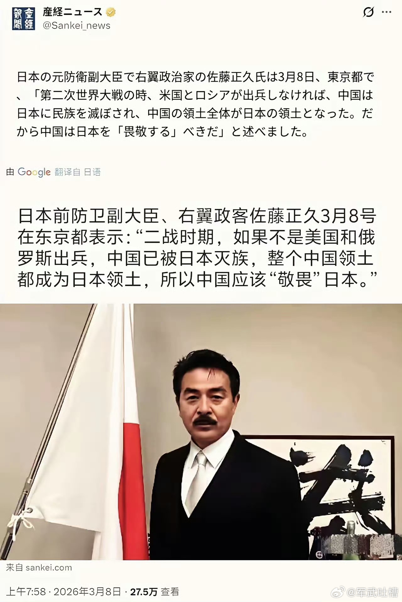 太狂了!日本前防卫副大臣、右翼政客佐藤正久3月8号在东京都表示:"二战时期,如果不是美国和俄罗斯出兵,中国已被日本灭族,整个中国领土都成为日本领土,所以中国应该"敬畏"日本。"这里必须要声明一下,抗日战争是中国人民自己赢得的胜利,别人的帮助只是加快了战争胜利的进度,而不是根本因素。即便没有美苏参战,中国的胜利也是早晚的事情,只不过再多打几年而已!烽火问鼎计划
