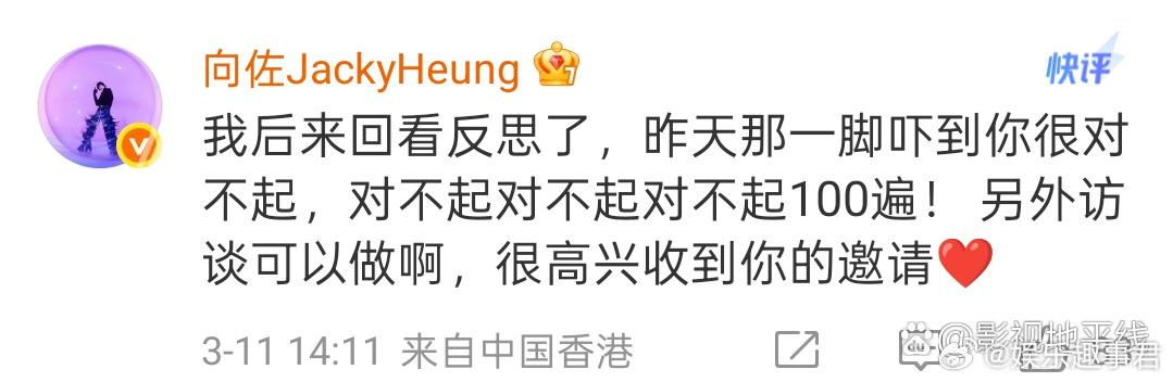 主持人百克力发视频回应向佐差点踢到自己的头,他表示第一下确实有点被吓到,相信向佐并不是故意的。向佐也在评论区向他道歉:“我后来回看反思了,昨天那一脚吓到你很对不起,对不起对不起对不起100遍!