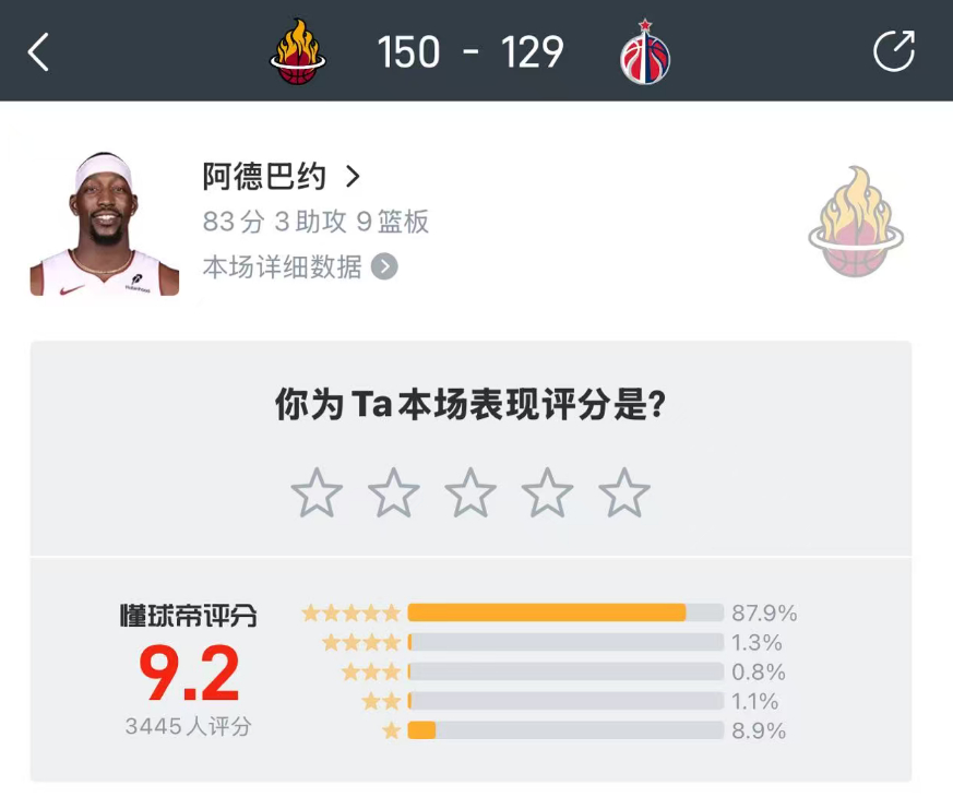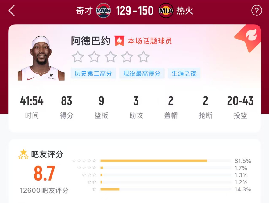 阿德巴约83分 赛后国内球迷评分情况