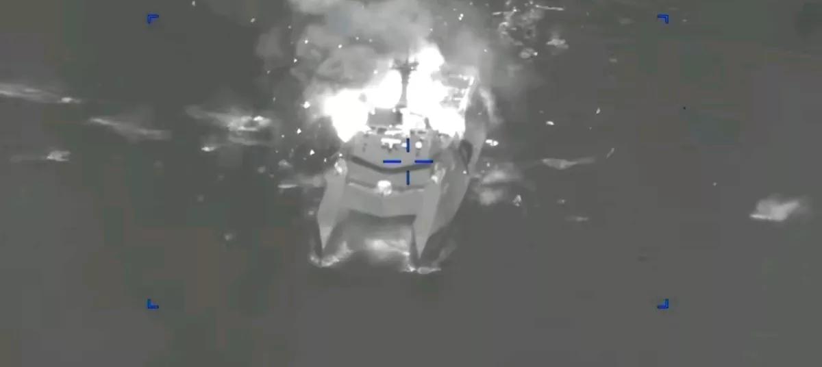 天空新闻消息,当地时间10日,以色列国防部新闻处发布视频,宣布当天以军战机在位于伊朗阿巴斯港附近海域,再次成功摧毁一艘革命卫队海军的大吨位护卫舰,加上这艘“沙西德.苏莱曼尼”级导弹护卫舰,以军已在“雄狮咆哮”行动中,连续单独击沉12艘伊朗舰艇。 相关视频显示,在被多枚导弹依次命中后,遇袭伊朗军舰发生剧烈爆炸,并在持续燃烧中快速倾覆。