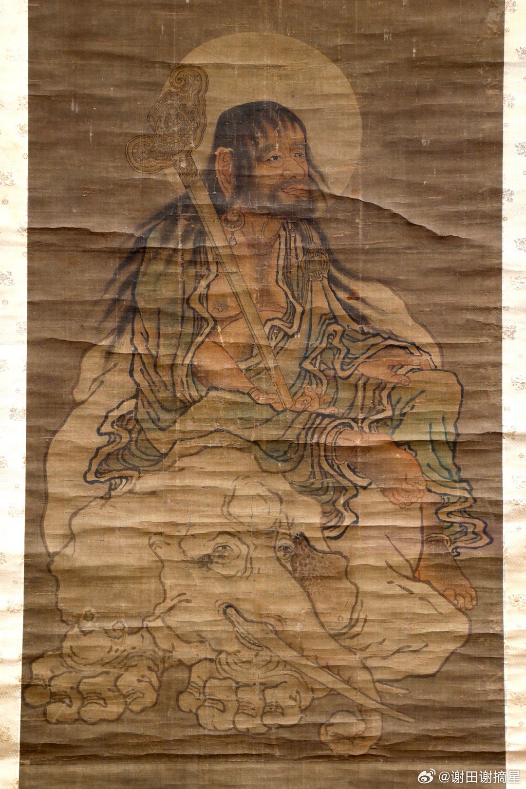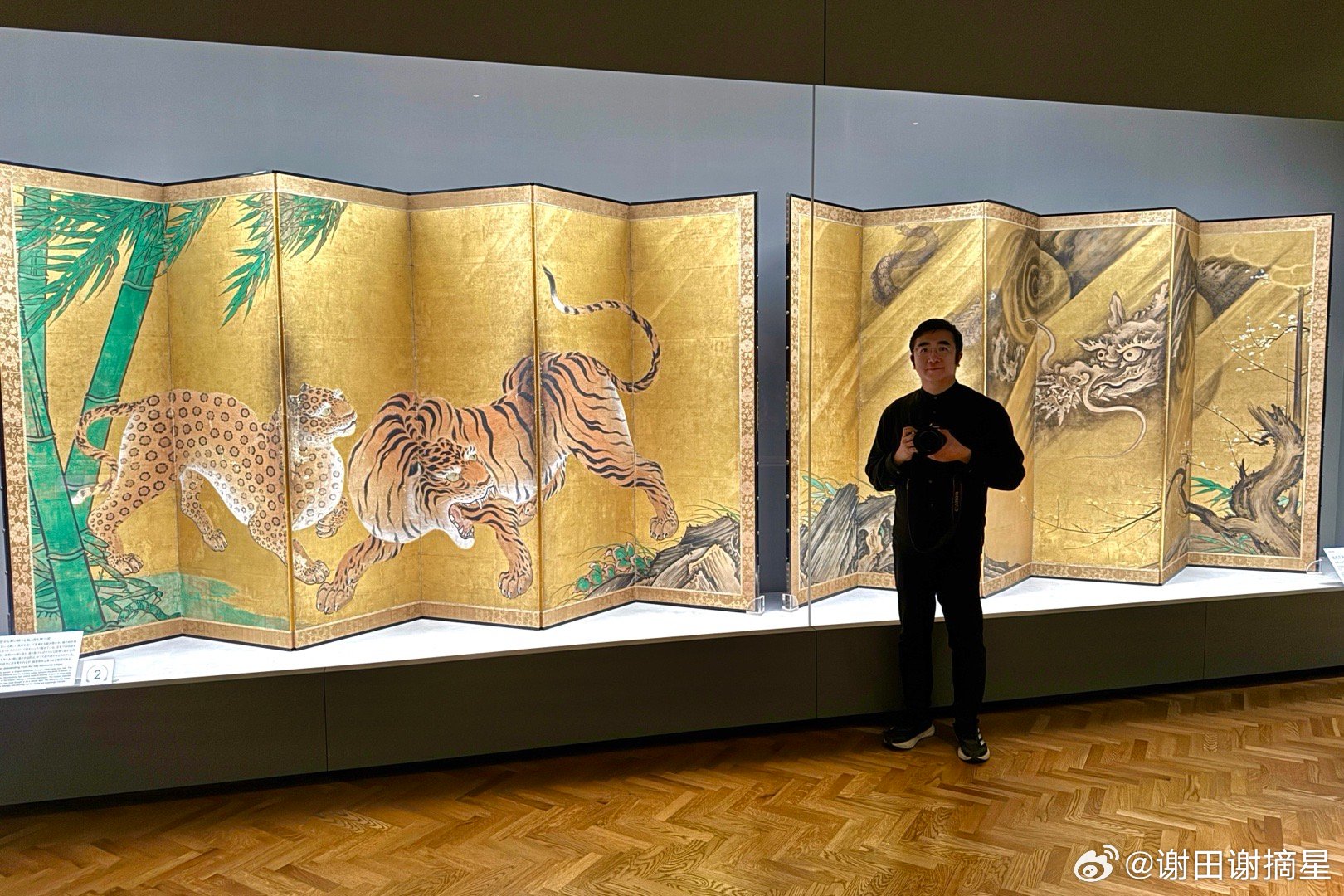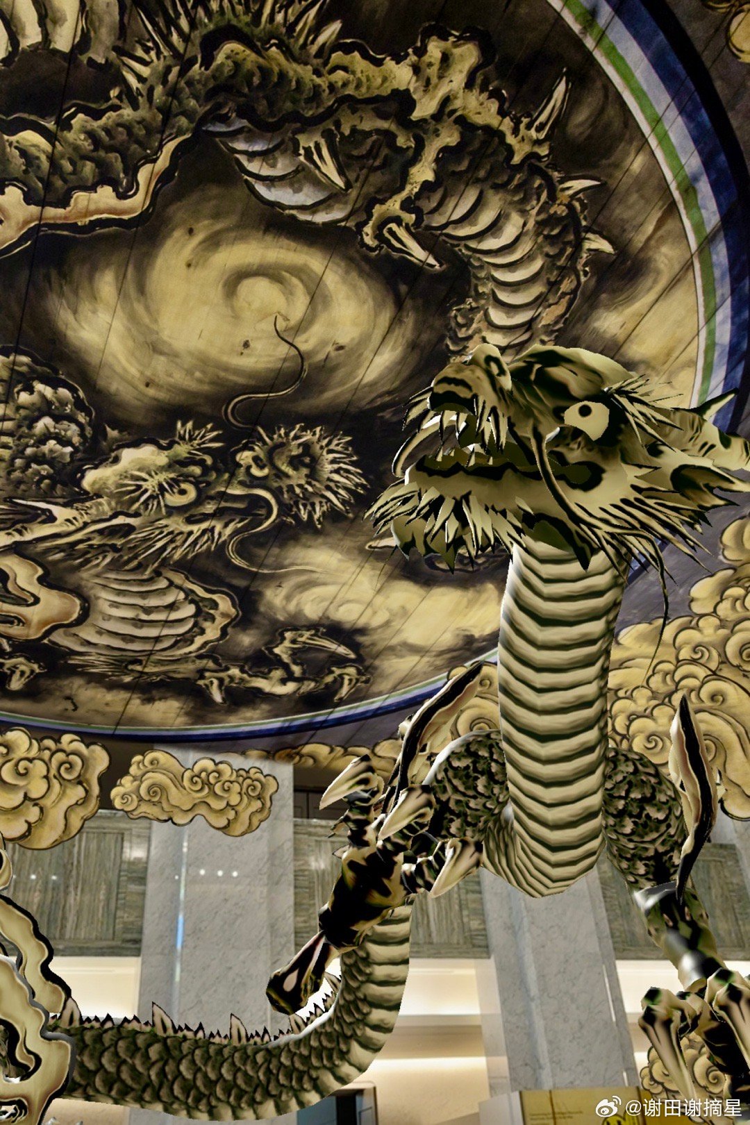 本次展览汇集多件日本重要文化财,图3是元代的普贤菩萨像,有很强的颜辉风格。图4、图6和图9都是17世纪狩野山乐绘制的屏风。图8是18世纪白隐慧鹤的达摩像。图5是这次特展上特别展示的视觉效果,手机上扫描一个二维码,可以看到龙在博物馆里飞。