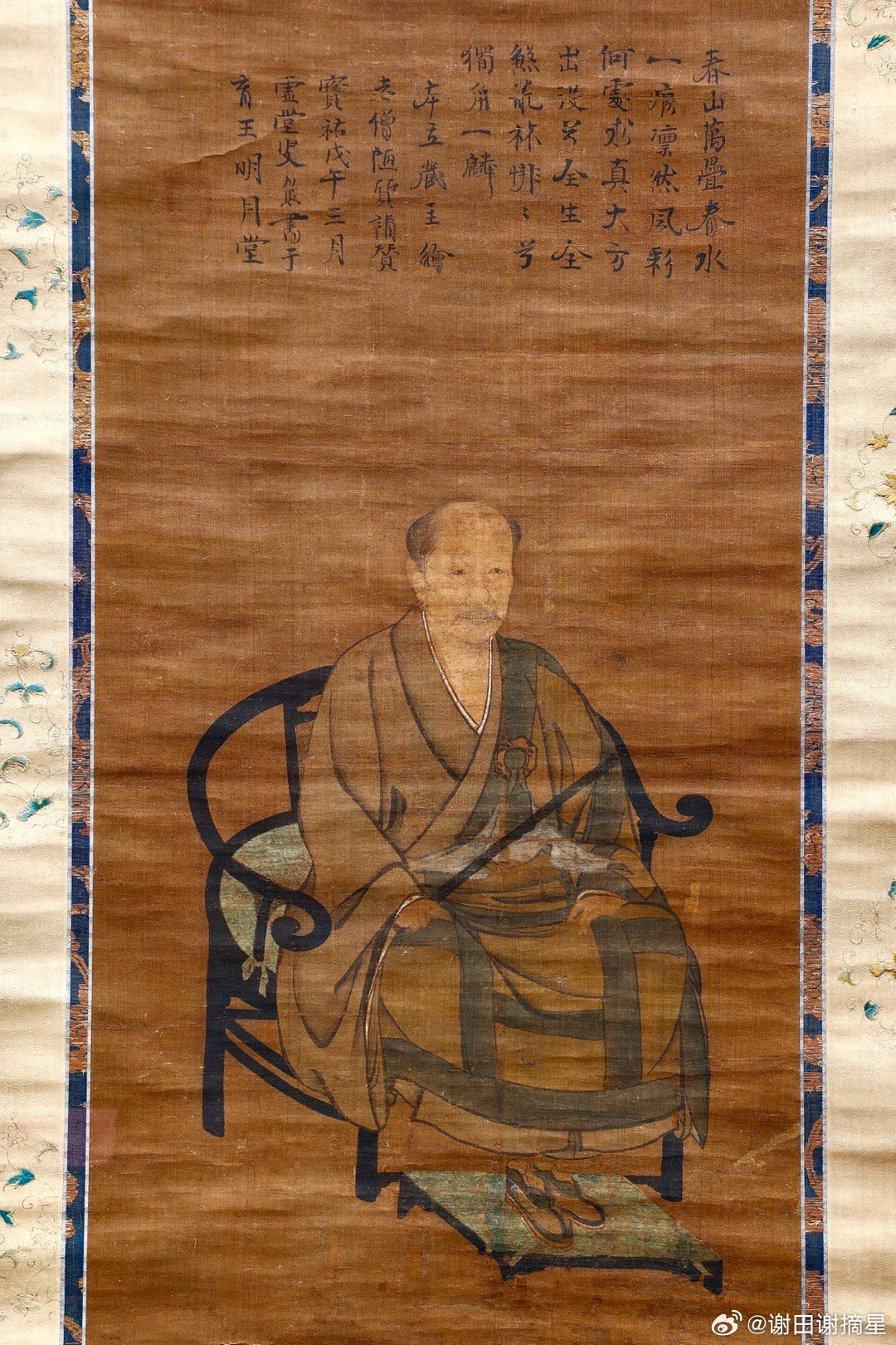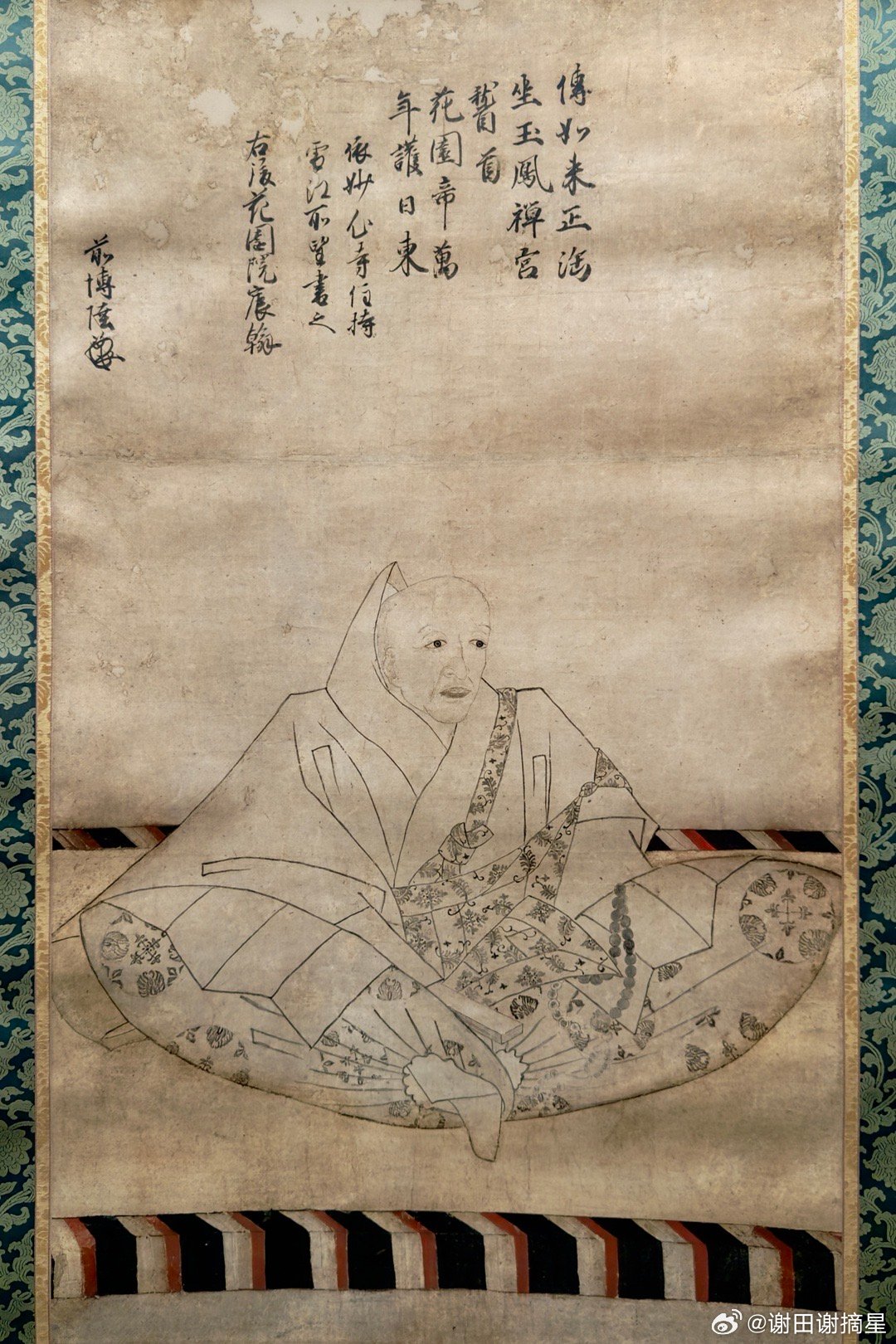 妙心寺的临济宗其实来自南宋,祖师虚堂智愚(1185-1269)俗姓陈,浙江象山人,南宋临济宗杨岐派高僧。日本僧人南浦绍明于1259至1267年间在虚堂座下学法,然后给日本带回了禅宗佛法和茶道。图1就是1258年绘制的虚堂智愚74岁画像,上面是他自己的题赞,这也是妙心寺最早的祖师像。微妙大师是虚堂智愚的第四代法孙,一休是虚堂的第七代法孙,所以一休自号是“虚堂七世孙”。