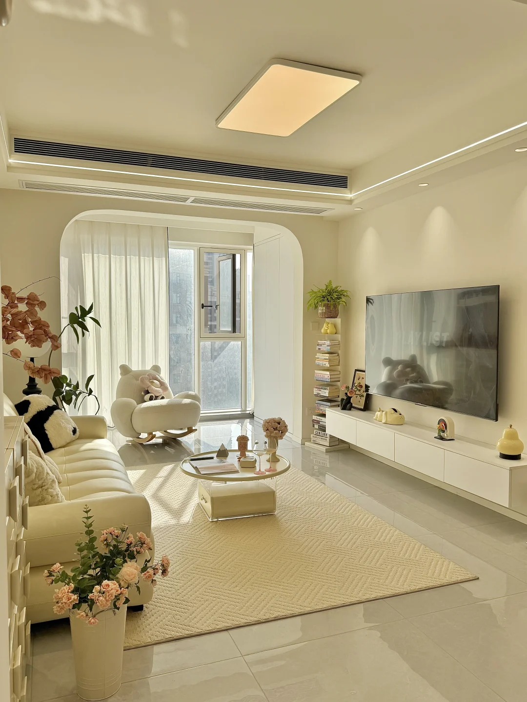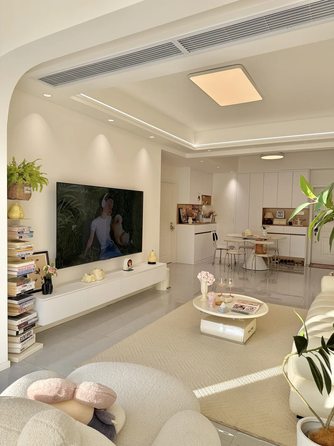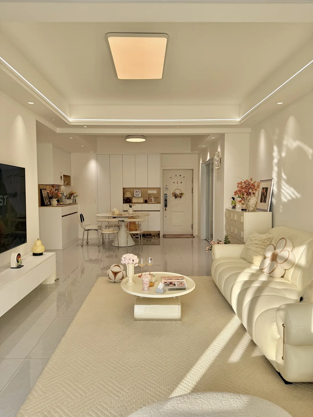 🏡我家建面95平两室一厅 预算不足,没请设计师全程自装 硬装花了7w,软装4w 我妈说这💰花的真值! 封阳台,客餐厅一体空间显得通透 瓷砖通铺,墙顶通刷奶油色乳胶漆 双眼皮吊顶➕弧形拱门,简单造型 奶油风软装选择了同色系更搭 沙发茶几地毯统一奶fufu色调~ 面积不大,但是自己用心装修出来的家 真的是越住越舒服~