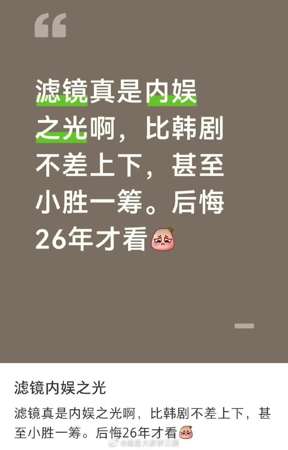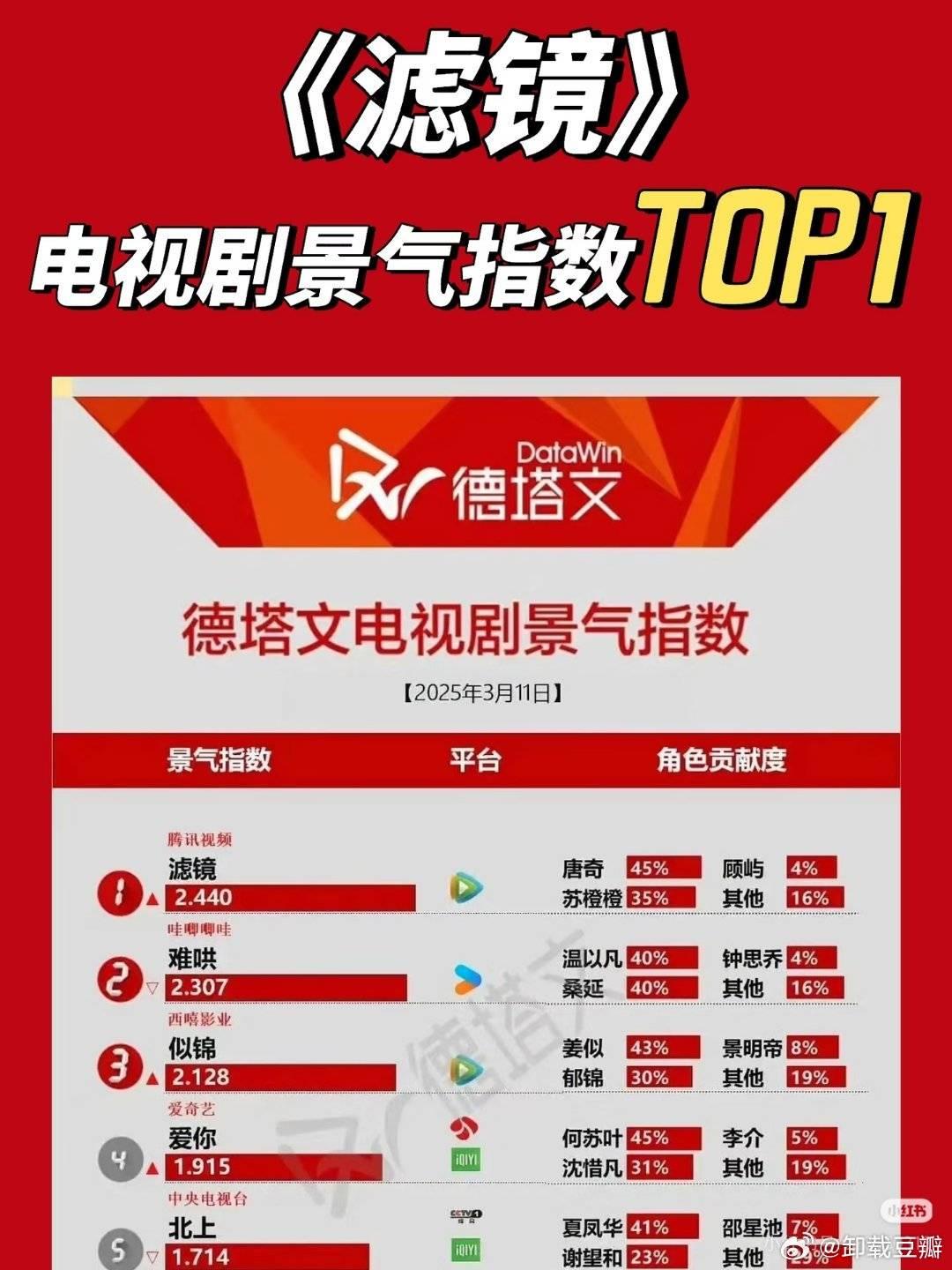 对于檀健次,李兰迪主演的《滤镜》我当时一直可惜它播放量,热度没有爆火!现在回想起来,滤镜不可惜吗?当然可惜。 那么高的讨论度,那么多爆梗,那么多高赞切片和二创,拉新和 SVIP 也都是很亮眼的成绩,却还是被人嘲笑数据扑了! 但这会影响什么吗?影响它是一部好剧吗?影响它吸引一大批神镜兵,被广电评为优秀剧集吗?影响在盘点 25 年剧的评论区里,被一堆真路人反复夸吗?影响开播一年之后,一个切片依然能接近百万高赞吗?显然不会影响。 最近看到这个剧的好多切片又火了,滤镜在没有营销的情况下纯靠自来水热度,能有这么牛的长尾,再次证明了实力是根本,作品是王道,好作品好角色永远是留在观众心中的! 从图2可以看出来,《滤镜》是真的没有宣发公司的,但就因为没有宣发没法让更多人见识它的好,没办法啊,现在酒香也怕巷子深,不过剧很棒,大家也都很棒,这就够了,其他强求不来! 光靠制作公司和明星工作室吆喝,却能在小小互联网搞出来这么大的动静,没人觉得了不起吗? 剧宣见面会檀健次跳舞可以有一个400w高赞的视频,小红书檀健次相关的帖子讨论量断层登顶第一,普普通通一条抖某一条回复高赞可以到20万+,关于滤镜的热搜vb双榜第一。这几个数据,能看出来,《滤镜》的声量真的很高很高。 然后,《滤镜》最让我震惊的是大量好评。这些好评都来自不同圈子的红v。点进去主页能发现什么领域的都有,其中不乏很多曾经对檀健次陌生甚至敌意的人,因为《滤镜》的高质量转而入坑。 《滤镜》最珍贵的地方,它让我欣赏到了檀健次惊人震撼的演技。剧情节奏好到飞起,唐奇这个角色作为戏眼,角色复杂度极高,但是我看到檀健次完美诠释了各个阶段有理有据值得信服的唐奇,他的情绪带动着观众相信了这个荒谬的故事,心潮起起落落。 云合是剧爆了可以用数据佐证,而不是数据证明爆剧。虚假的泡沫只会带给人看似光鲜亮丽其实一捅就破的谎言 谁是傀儡谁是玩物,谁没有灵魂一目了然 。 没有剧情讨论的“爆剧”一文不值。 我相信随着时间的证明,《滤镜》的含金量还会一路飞升。
