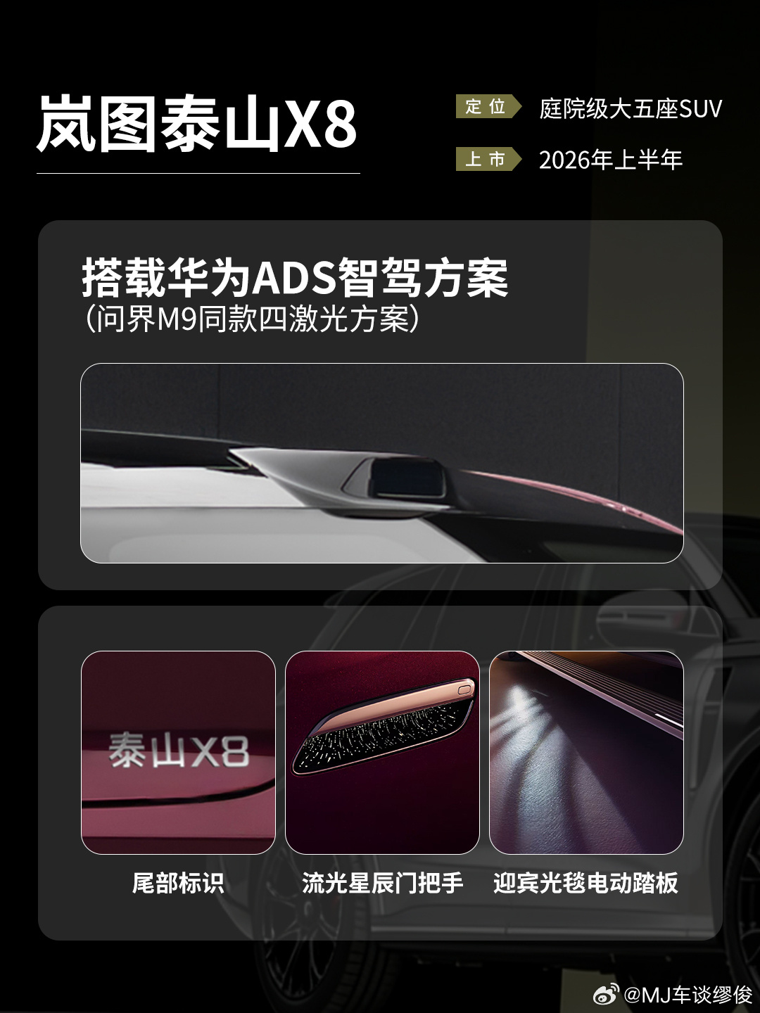 岚图泰山X8终于官宣定档3月19日,这台车一出来就很有看点。作为岚图与华为深度合作的旗舰大五座SUV,它将首发搭载华为新一代智能座舱,再配上四激光雷达与多项黑科技,智能化底子相当扎实。