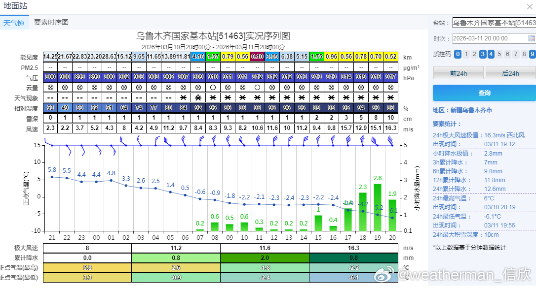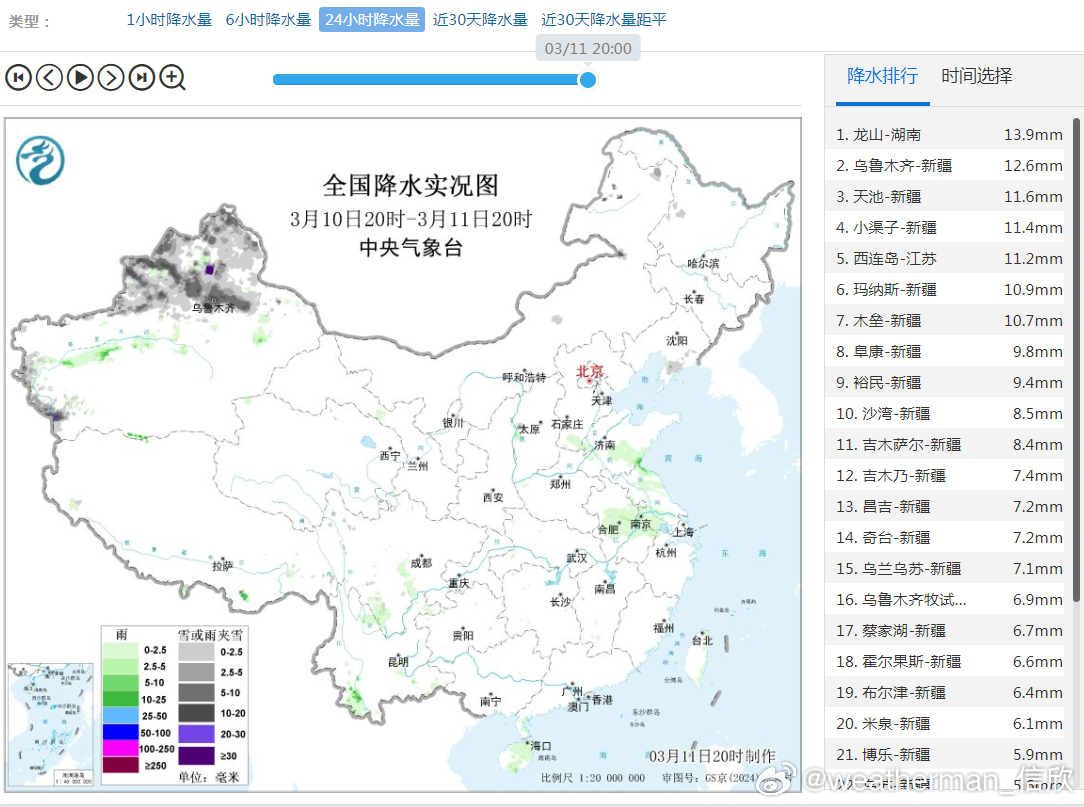 【雨雪】昨晚到今天,新疆北部因为冷空气影响,出现大范围降水,降雪为主。乌鲁木齐老国家站,降雪量12.6毫米,按照国家标准,达到了暴雪级别。今晚20时积雪有10厘米。未来冷空气继续东移,乌鲁木齐明天降雪明显减弱,但在新疆天山东侧和南侧、以及新疆西南部山区可能还有大雪,局地暴雪。