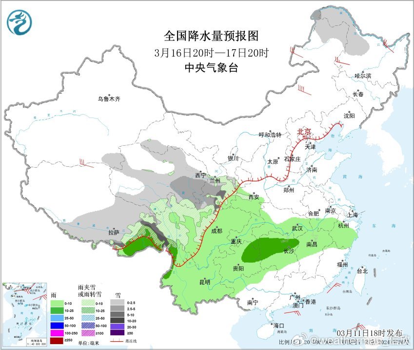 此外,3月12日20时至13日20时,西藏东南部等地有大到暴雨。3月13日20时至14日20时,陕西南部、河北南部、河南西部、四川盆地东北部、云南西部、西藏东南部等地部分地区有中到大雨,局地有暴雨。15日以后,冷暖空气将在长江沿线附近持续交汇,导致阴雨频繁,18日降水还可能向北扩展。
