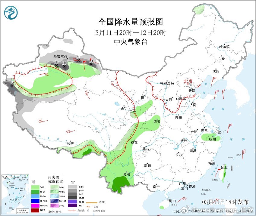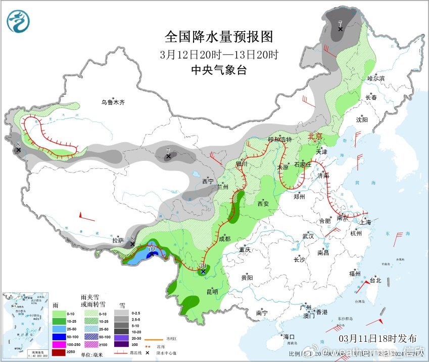 预计3月13日20时至14日20时,青海东部、甘肃中东部、宁夏、陕西中北部、黑龙江大部、吉林中东部、辽宁中东部、山西大部、川西高原以及西藏东部等地部分地区有小到中雪或雨夹雪,其中,甘肃东南部、陕西北部、山西北部等地部分地区有大到暴雪(10~12毫米)。