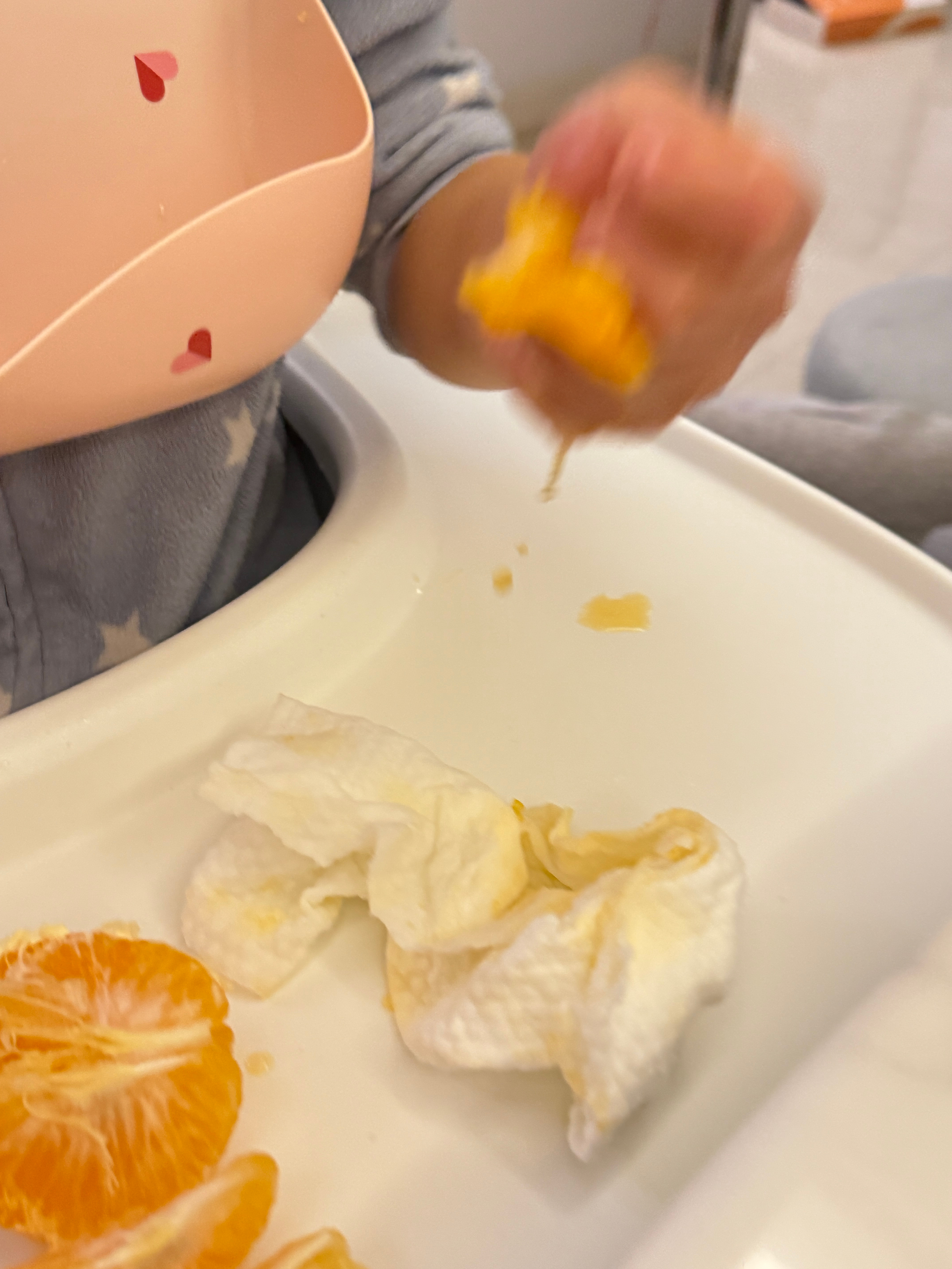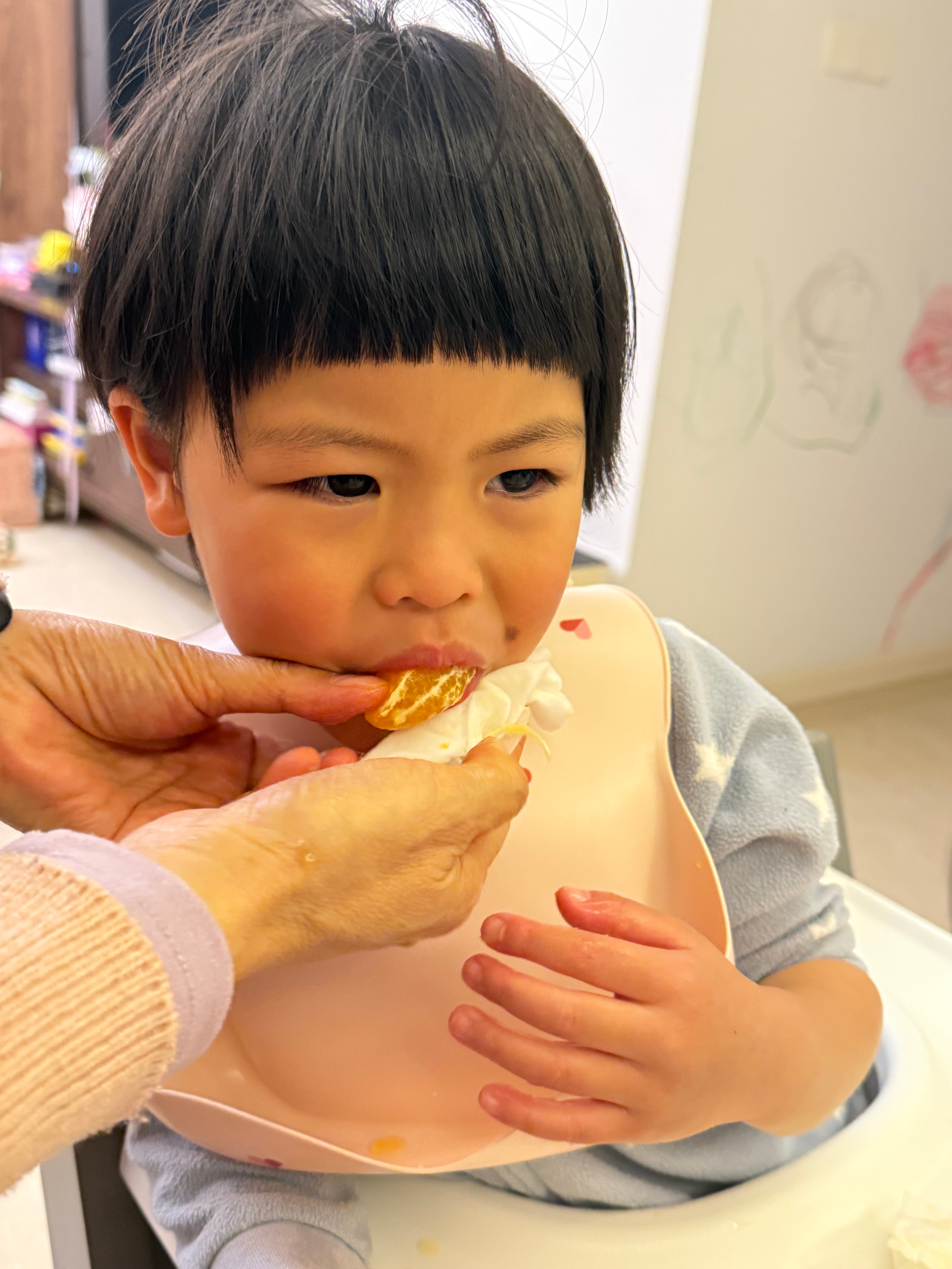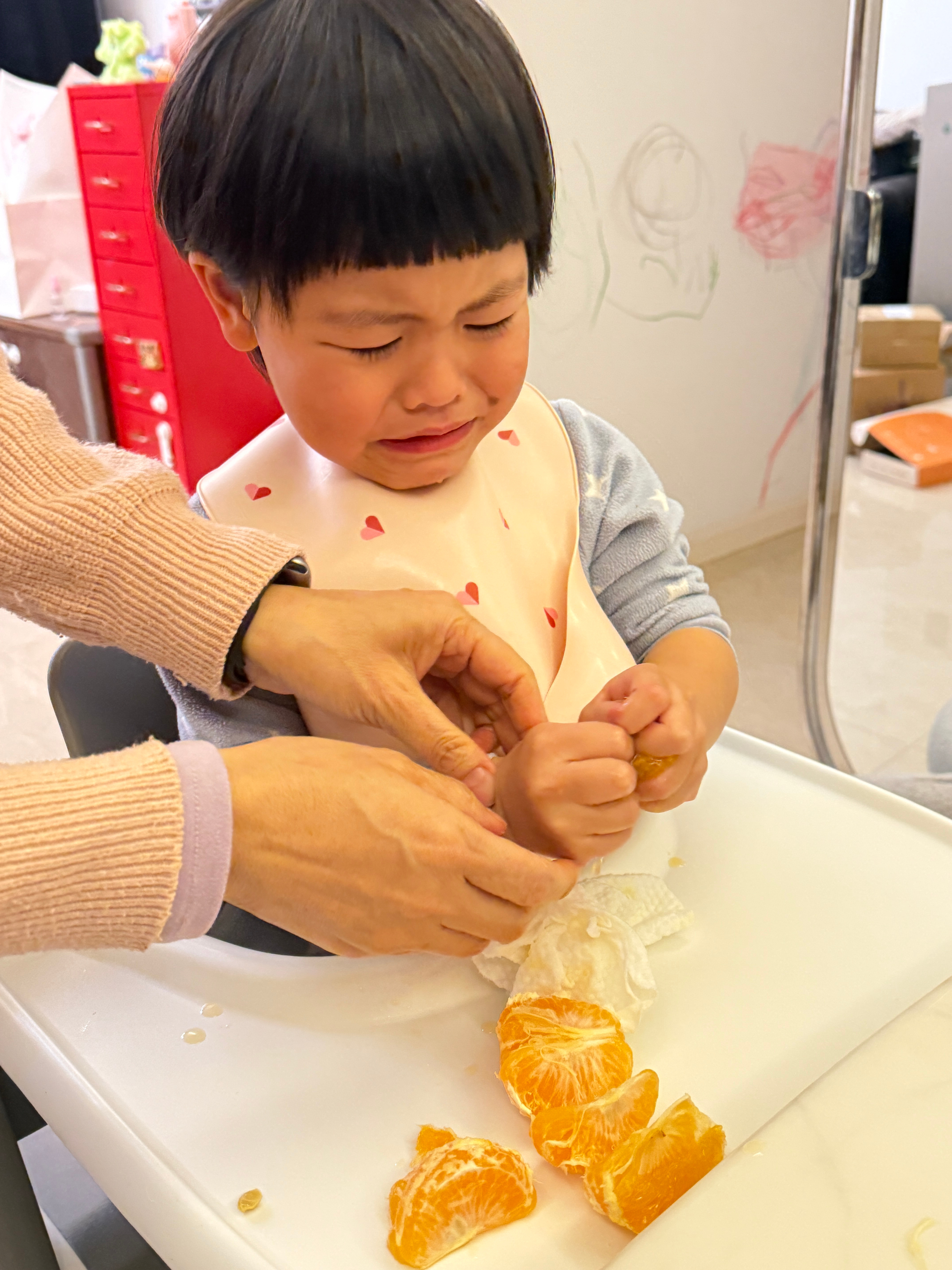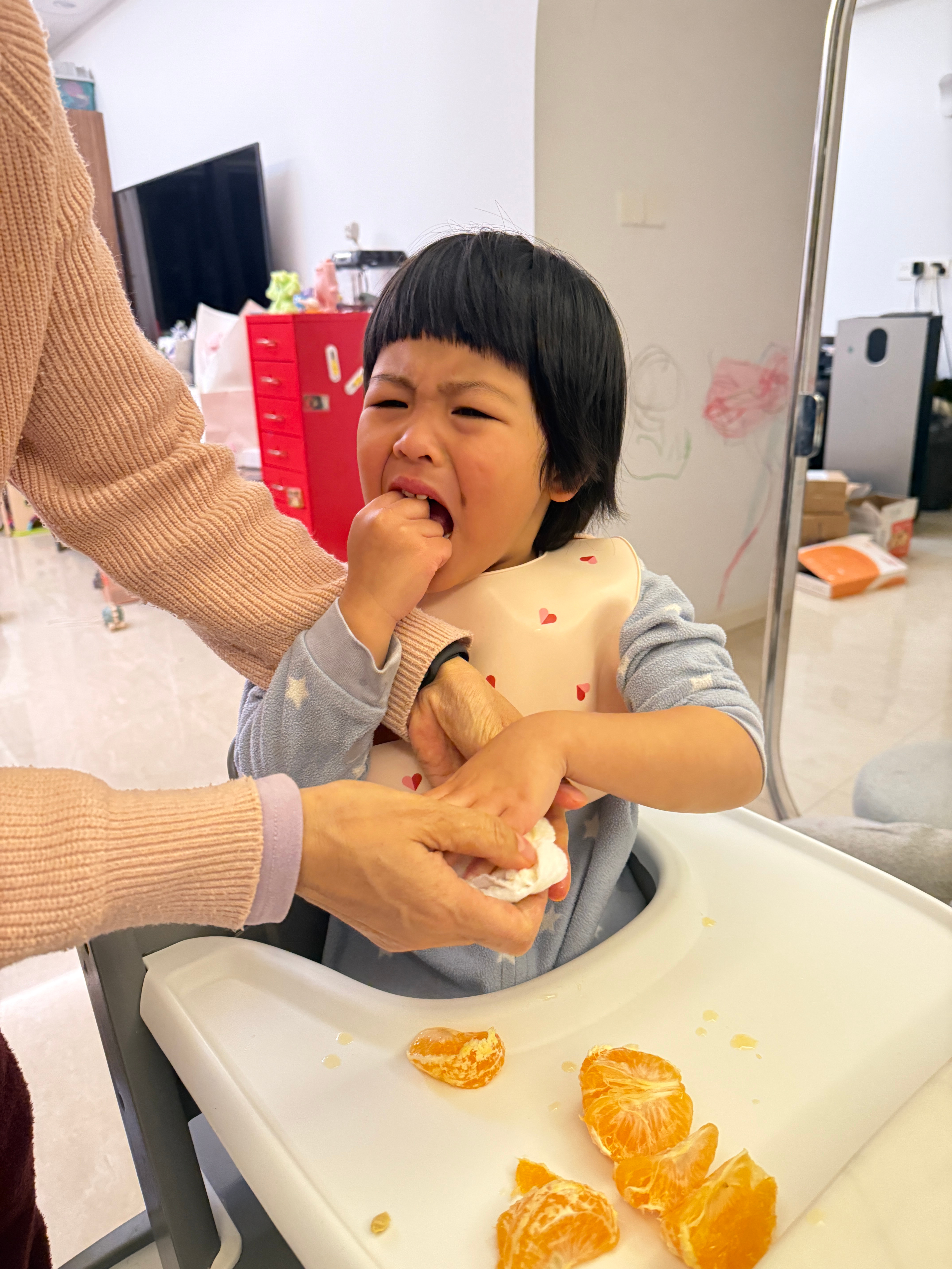 球宝提出要喝橘子汁压压说下午已经喝了五个橘子了,不能再喝了球又提出新要求说直接吃橘子只好同意了