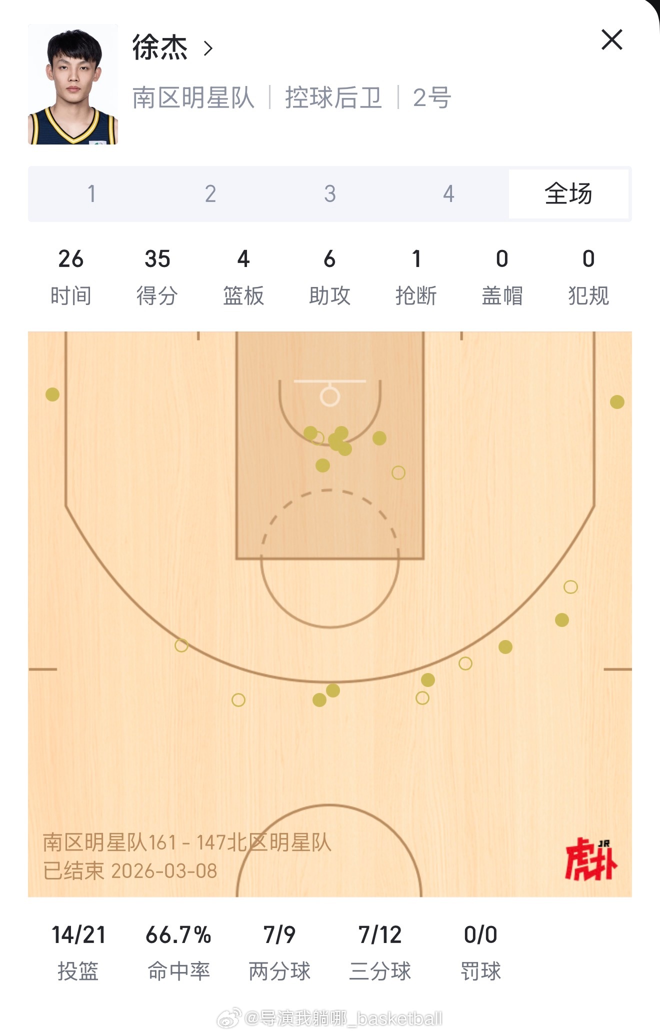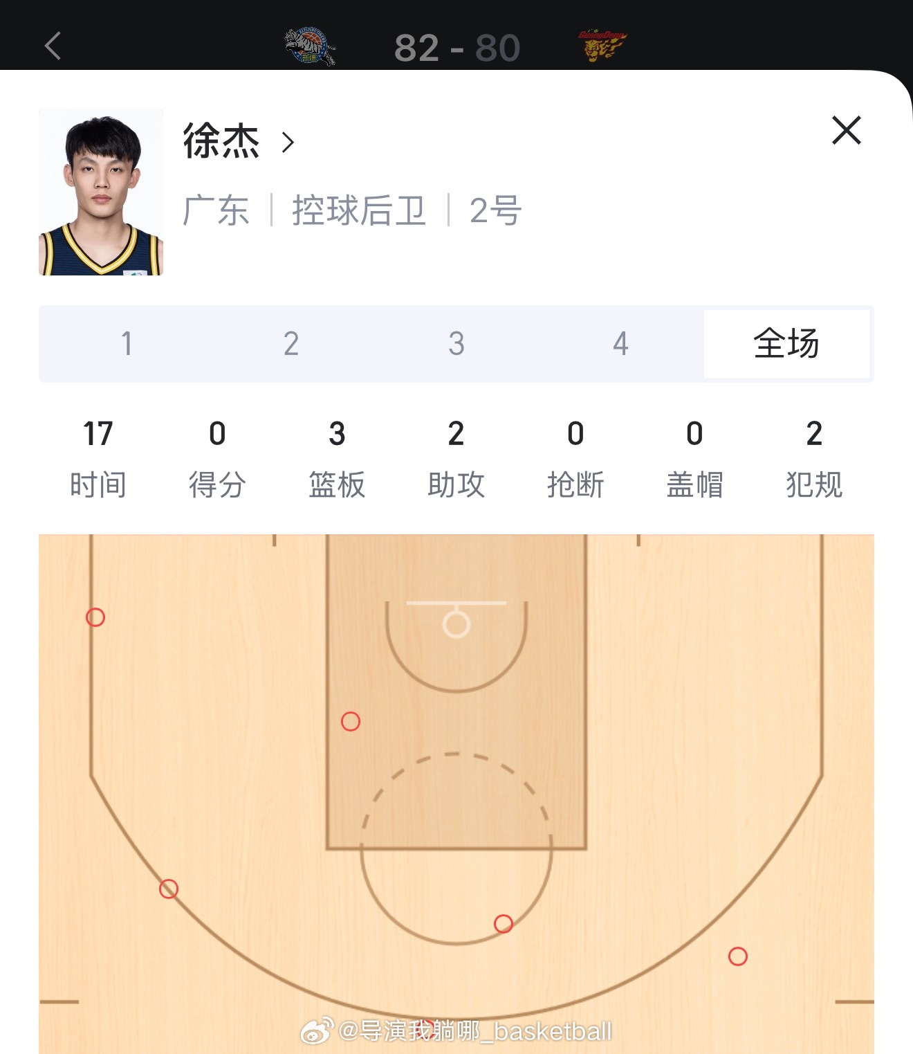 全明星赛太费体力了,在四天前的全明星赛上爆砍35分拿到MVP的徐杰在今晚尽显疲态,他全场6投0中拿到0分