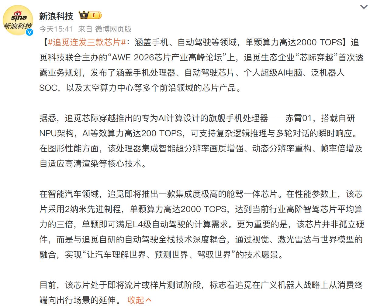 梦想还是幻想? 最近几个月追觅持续上热搜,可以说流量是吃到撑啊。 现在追觅又有了大动作!连发多款芯片还要发射 200 万颗算力卫星! AWE 2026 芯片产业高峰论坛上,追觅生态企业芯际穿越首次曝光芯片布局,多款重磅产品亮相。手机端赤霄 01 处理器搭载自研 NPU 架构,200TOPS 的 AI 算力可支撑复杂 AI 交互;2 纳米制程的舱驾一体芯片算力达 2000TOPS,单颗就能满足 L4 级自动驾驶需求。 更令人瞩目的是,追觅计划发射 200 万颗瑶台系列算力卫星,打造太空超级算力中心,其算力盒已完成空间测试,即将入轨验证。搭配自研星间激光通信技术,未来有望搭建起服务 AI 大模型训练的太空分布式算力网络,追觅的全场景算力布局太惊艳!