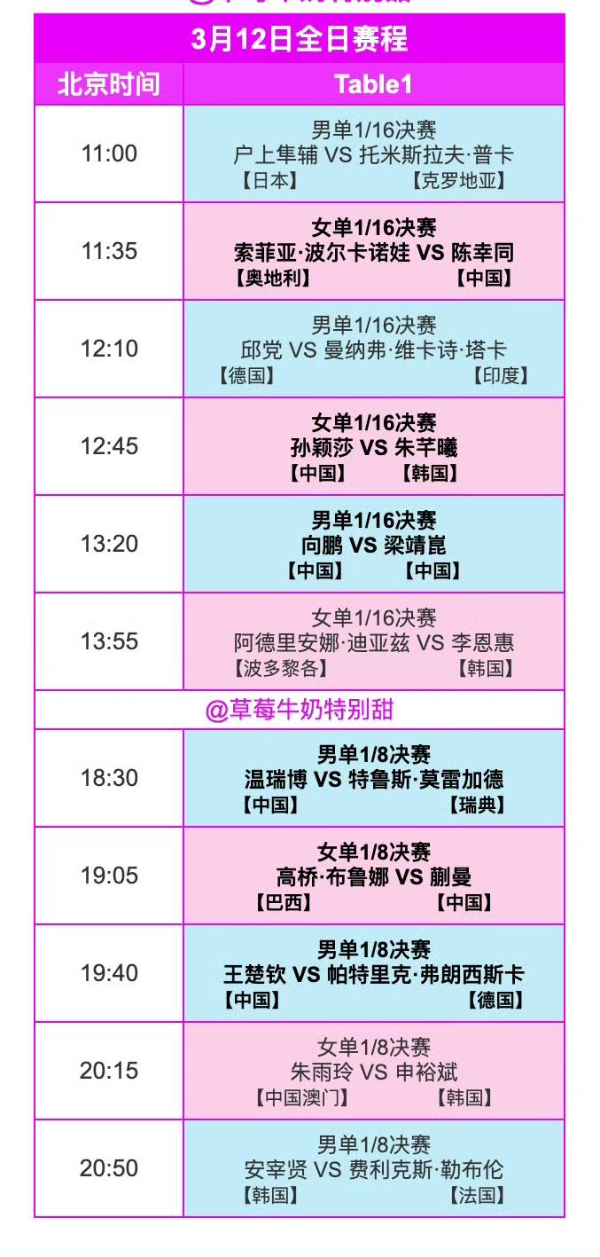 明天赛程来喽! 2026WTT冠军赛重庆站明天即3月12日(周四)全日赛程新鲜出炉! 明天中午依旧是首轮比赛,孙颖莎就在中午十二点四十五展开她的重庆站首秀! 但明天晚上就是第二轮比赛了,我们的王楚钦、温瑞博、蒯曼都将出战——明天是目前最值得关注的一天[奋斗]! (感谢草莓老师的图片)
