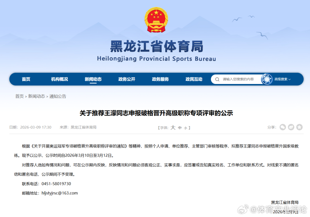 黑龙江省体育局官网发布关于推荐王濛同志申报破格晋升高级职称专项评审的公示。根据公示,按照个人申请、单位推荐、主管部门审核等程序,拟推荐王濛同志申报破格晋升国家级教练。