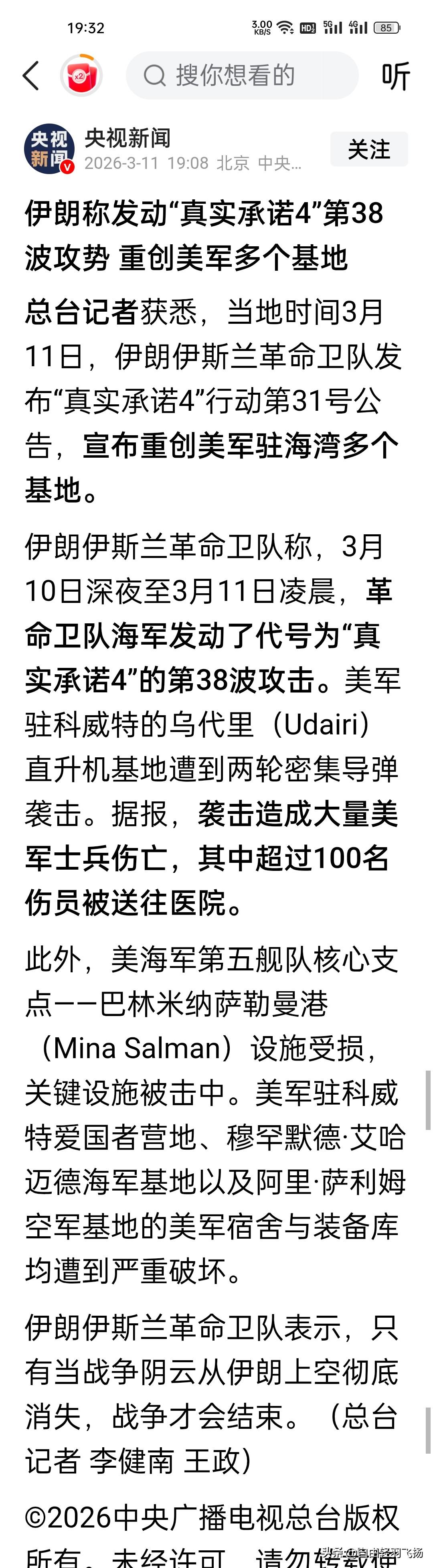 根据央视新闻报道,伊朗伊斯兰革命卫队称,3月10日深夜至3月11日凌晨,革命卫队海军发动了代号为“真实承诺4”的第38波攻击。美军驻科威特的乌代里直升机基地遭到两轮密集导弹袭击。据报,袭击造成大量美军士兵伤亡,其中超过100名伤员被送往医院。 士别三日当刮目相看,伊朗这次话不硬但是打了最硬的仗。美以这次认为还像以前遇到的都是软脚虾,哪知碰上上伊朗这块硬骨头,结果几颗门牙给崩掉了。所谓天道好轮回,苍天饶过谁,美以自以为的军事优势如今也在瞬间化为乌有。 川普急功近利,没想到为了中期选择想立点功,那知踢到铁板上,这下够呛了。这些伤亡的美军,如果怪伊朗,就错了!怪就怪你你们的特朗普总统吧,是他在中东到处欺负别人,别人只是自卫罢了。 特朗普根本没有想到伊朗这块骨头这么难啃,怎么才能不伤脸面结束这场战争。伊朗怎么对美国的策略对世界提供了极其宝贵的经验,专门打你基地,使你后勤保障无法提供,用无人机对付你高昂的导弹,进行不对等却很奏效的战术,美国他是拖不起的,最终只能重新坐下来谈。 美以的非法军事轰炸伊朗,不可能摧毁这个国家,只会激起伊朗人民万分的怒火和空前的团结,一致对外自卫反击。这次美以伊战争,美国尝到伊朗的苦头了,以后还敢再那么地猖狂霸道吗?当一个民族焕发出我死无所谓,但我一定要你死的悲壮而伟大信念时,这个民族值得敬仰! 伊朗选出了新的铁血领导人,想让伊朗投降只能是痴人说梦。战争贩子最后的结局是被送上历史的审判台,美以要想生存,唯一通道就是和平之路!