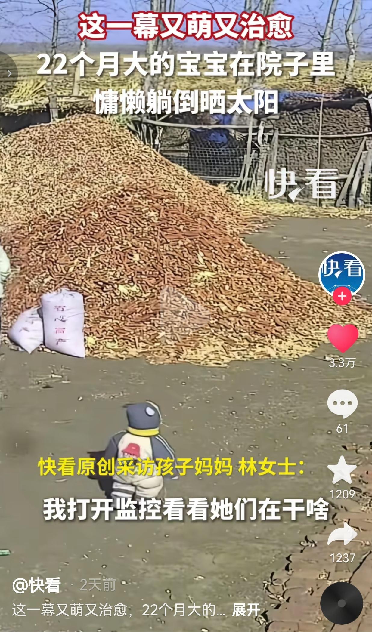 这才是童年最治愈的模样!一萌娃在东北姥姥家的院子里,一个才22个月的小宝宝,穿着圆滚滚的企鹅小衣服,小短腿一晃一晃的,走到一堆晒得暖乎乎的苞米瓤子旁边。 “啪叽”一下就躺平了,四仰八叉地晒起太阳来。小脸埋在金黄的玉米芯里,眼睛眯成一条缝,浑身懒洋洋的,跟一只晒舒服了的小奶猫一模一样。 宝宝妈妈说,这孩子就特别喜欢这样,一会儿躺苞米叶上,一会儿躺草垛里,专门找软乎乎的地方当自己的小床,安安静静地偷懒发呆。 网友看到后评论说:“全网都在羡慕这个宝宝,我们羡慕的不是晒太阳,是无忧无虑、不用内卷、想躺就躺的童年啊!” 也有的网友说:“小时候疯玩一身土,大人骂两句也开心;现在孩子干干净净,却少了那份撒野的快乐。” 还有的网友说:“别总逼孩子学这学那,能安心晒太阳、痛快玩一场,比什么早教都管用。” 看到这一幕,我一下子就想起了自己小时候。在奶奶家的麦秸堆里打滚,在晒谷场的玉米堆里躲猫猫,蹲在田埂上看蚂蚁搬家,一玩就是大半天。 那时候的快乐真的特别简单,就是泥土的味道,太阳的温度,还有被家人护着、安安全全的感觉。 再看看现在的孩子,一天到晚被安排得满满当当,早教、兴趣班、电子产品……我们总想着让孩子学这个学那个,却忘了,童年最珍贵的根本不是学会了多少本事,而是能在安全的地方,痛痛快快地玩、安安心心地发呆。 就像这个小宝宝,躺在苞米堆里晒太阳,看着啥用没有,可这就是最纯粹、最难得的快乐啊——被太阳照着,被大地抱着,整个人都松松垮垮的,特别安心。 很多人说这是放养,可我觉得,这才是养孩子最好的样子。让孩子摸摸泥土、晒晒太阳,在自然里慢慢长大,比上多少早教班都强,能养出一颗温柔又有力量的心。 对此,你有什么看法呢?欢迎大家评论区讨论留言。