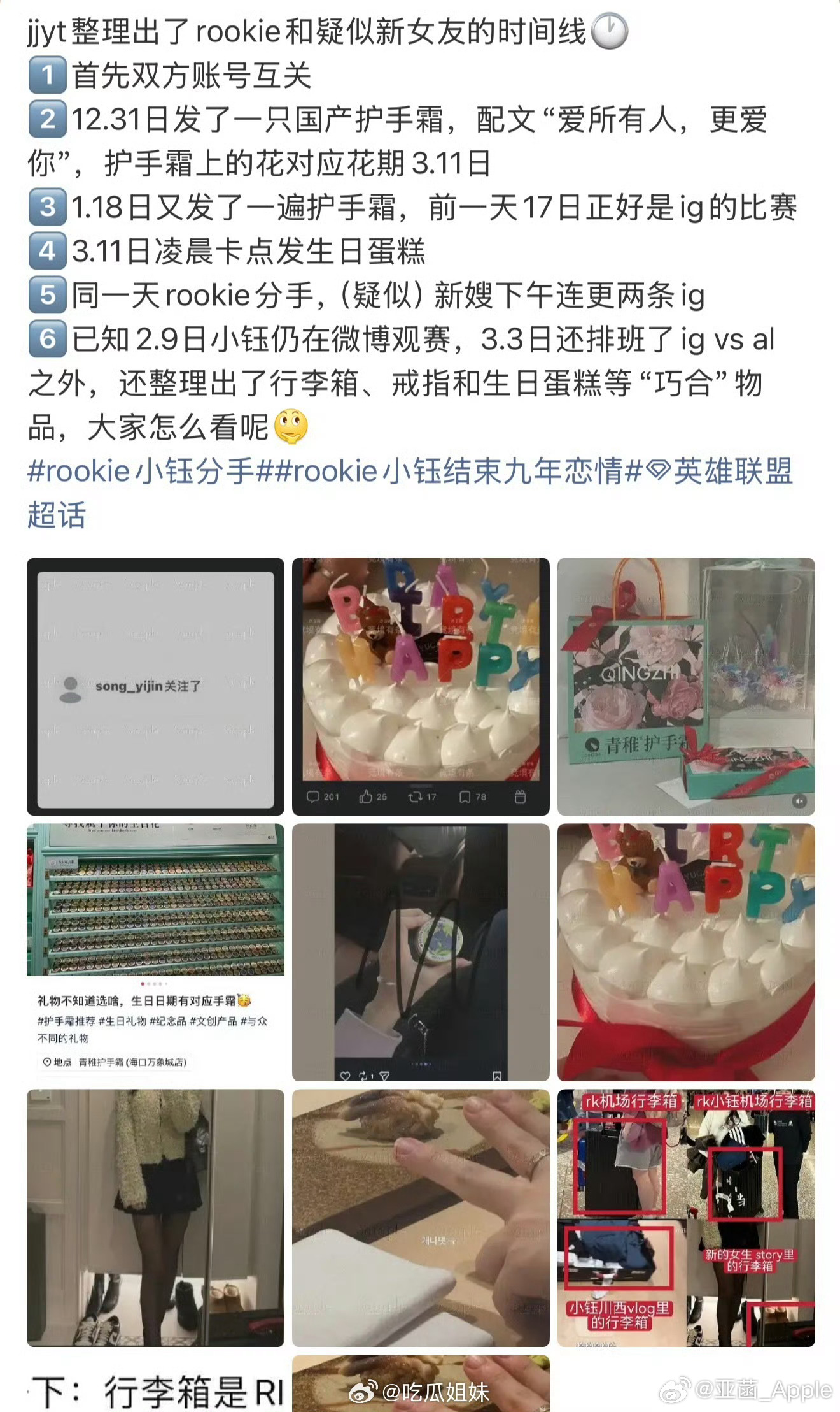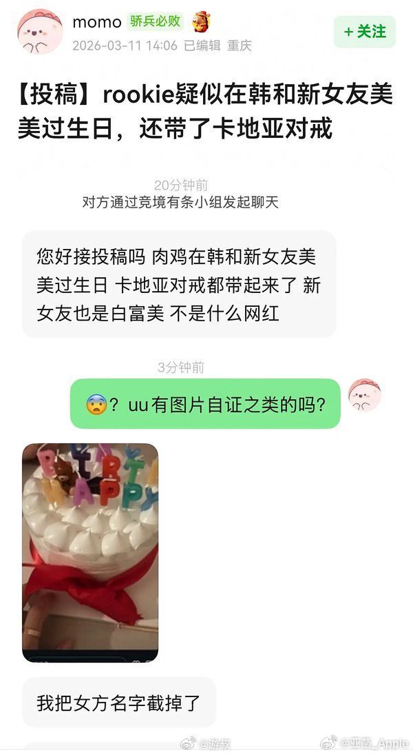 女网红和Rookie互关。3月11日Rookie生日,卡点发了生日蛋糕。女网红晒出照片里的行李箱,和Rookie的行李箱一样,还是特别定制款。