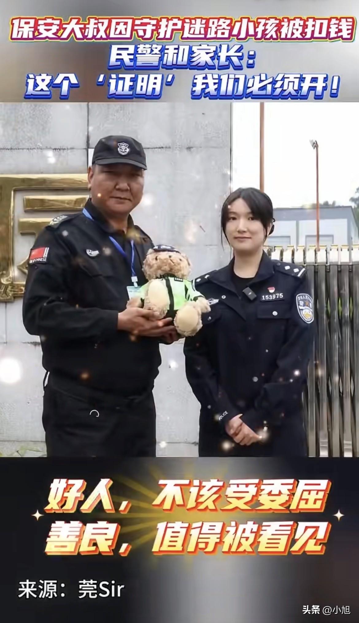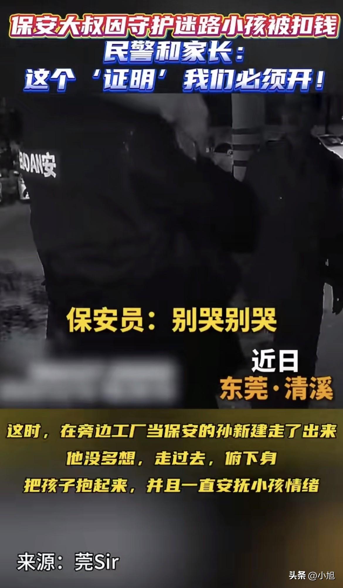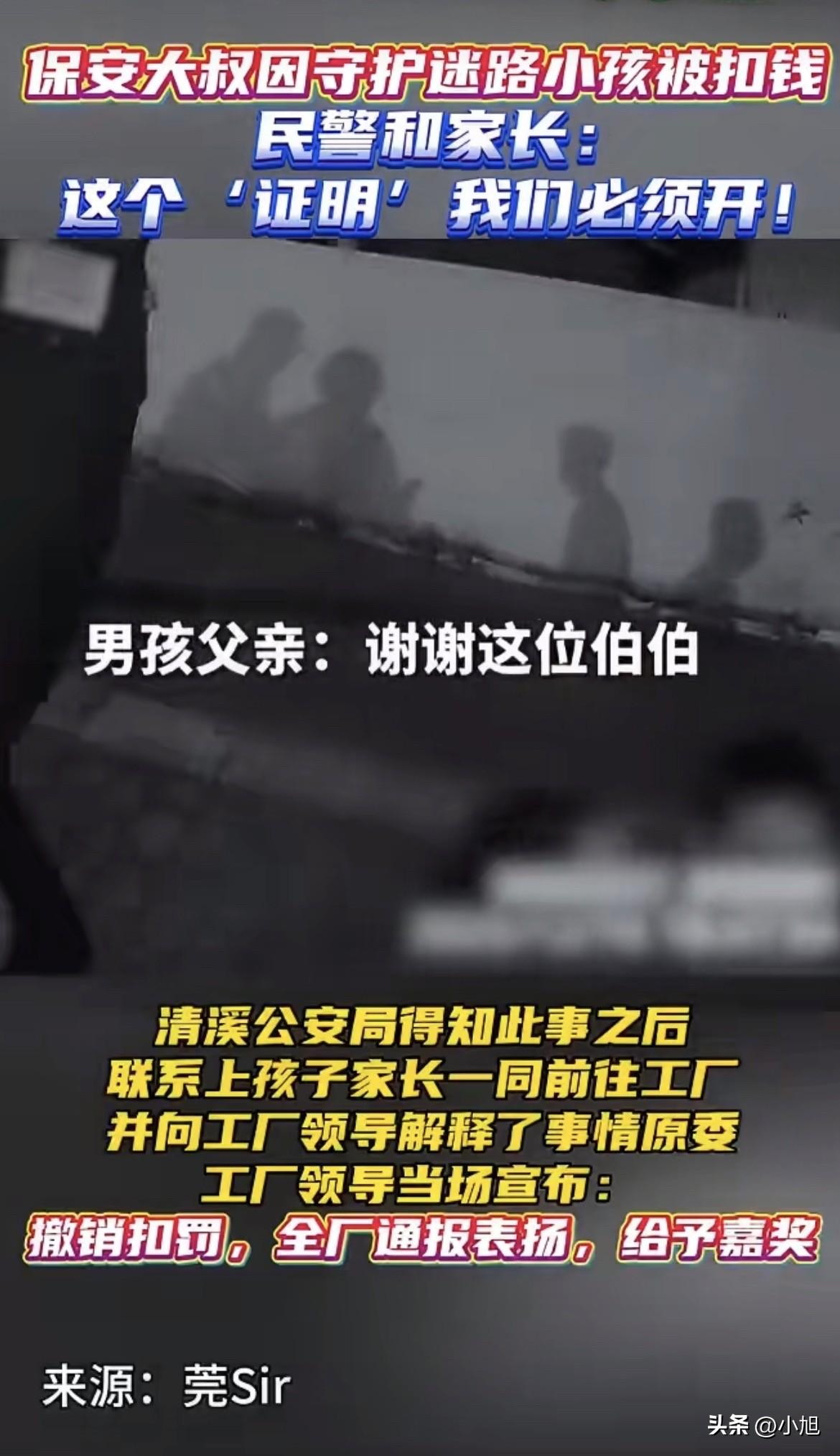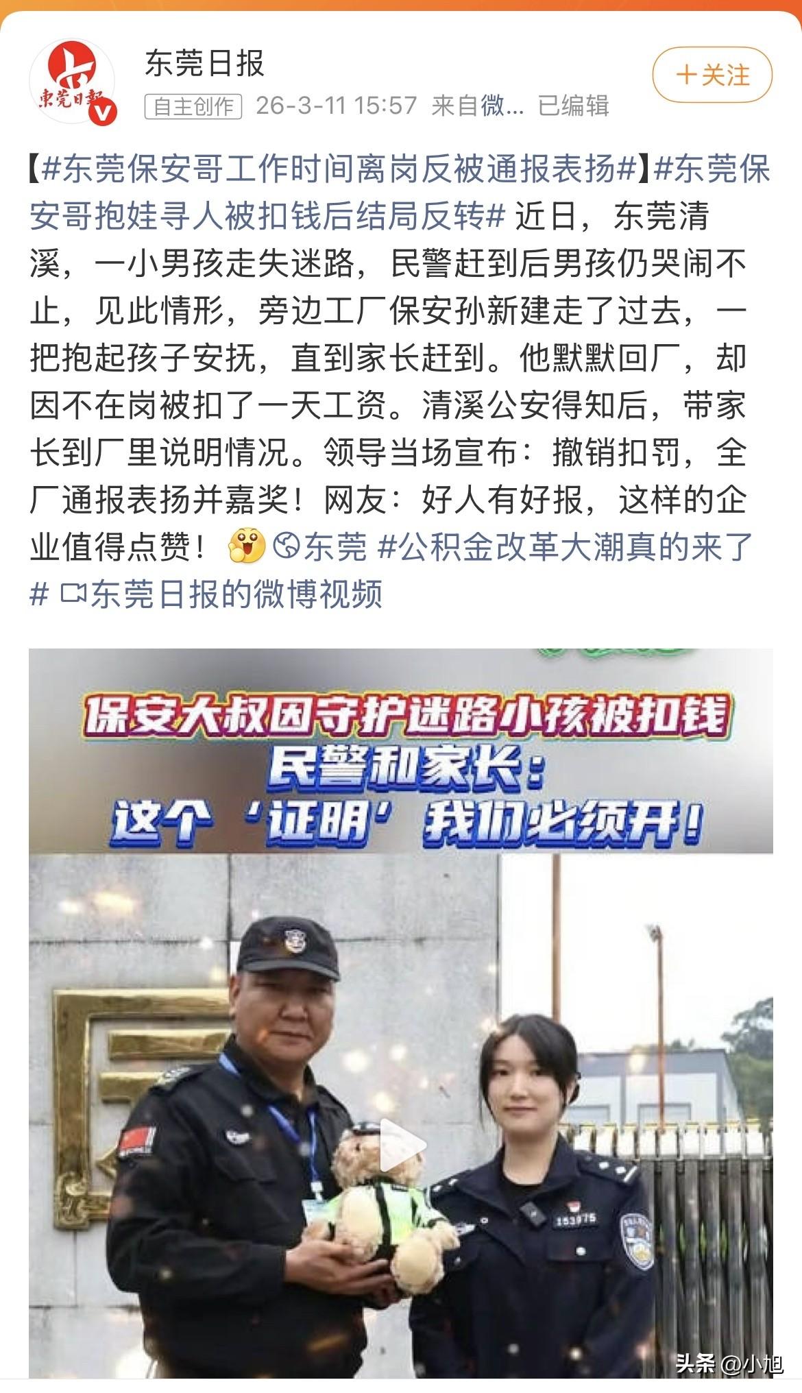 东莞一个保安,因为救人被扣了工资。你猜最后谁帮他说话的?是派出所的民警。 这人叫孙新建,在清溪一家工厂当保安。那天他还在岗,看见路边一个小孩哭得撕心裂肺,旁边站着民警,可孩子就是不让碰。他没多想,走过去把孩子抱起来,轻声说了句:“别哭,我带你回家。”孩子趴在他肩上,居然真不哭了。 他就这么抱着孩子,跟民警一条街一条街地找,走了快一个小时,总算找到了家长。孩子爸妈拉着民警的手道谢,民警往旁边一指:“这位大哥功不可没。”家长转过来谢他,他摆摆手,转身就回厂里了。 回到厂里他才想起来,自己还有半小时才下班,刚才太急,连假都没请。领班发现他不在岗,按规定扣了他一天工资。 他没解释。他跟记者说,当时想的是,自己确实离岗了,扣钱应该的。 可过了几天,他心里那根刺还是没过去。他不是心疼那一百多块钱,是怕厂里人误会他工作偷懒、溜出去玩。后来他对着民警说出了那句憋了好久的话:“被扣钱没关系,可不想被误会是我工作不认真。我只想要个清白。” 这话说出来的时候,他自己可能都觉得有点傻。一个保安的清白,能值几个钱? 可他没想到的是,那几个民警听进去了。 清溪公安分局的民警专门联系上那个孩子的家长,俩人一块儿来到他厂里。家长当着他领导的面,再次鞠躬道谢。民警还特意带了个“警察小熊”公仔,亲手递到他手里,向厂里领导把事情原原本本说了一遍。 厂领导当场就表态了:撤销扣罚,全厂通报表扬,还要给嘉奖。 这事要是搁网上,大概率又是一条“好人好报”的暖心新闻。可仔细想想,这事真没那么简单。 你看啊,孙新建那天做的事,说白了就是“擅自离岗”。按厂规,扣钱没毛病。他自己也认。可问题是,如果那天他没出去抱那个孩子,如果那孩子真出点什么事,这一百多块钱能买回来什么? 厂规是死的,人心是活的。可现实中,很多时候“活的”要给“死的”让路。 我查了一下,东莞保安这个群体,其实挺难的。之前有个保安叫李晓军,刚入职就被扣了500块“押金”,说是怕中途跑路。真到了合同期,公司总能想出办法把钱扣掉。 还有个保安叫冯世海,50岁了,在小区当保安。工厂夜里被盗,损失几千块,保安公司直接把责任转嫁给值班保安,每人扣600。有保安跟记者说,上班去个厕所都能成为扣钱的理由。 更离谱的是,以前东莞有个保安叫顾仁中,因为追讨7400多块加班费无果,最后剁了自己一根手指。还有人在问政平台上投诉,振安保安公司离职就要扣390,法定节假日上班没有三倍工资,劳动合同都不让看清就按手印。 一个保安说:“一个月挣一千元,自己肯定要买些烟抽,再刨去扣了的600元,8个月下来挣得还不到4000元。” 这话听着扎心。一个月挣一千,一天也就三十多块。孙新建被扣的那一天工资,可能就是他一家人一天的菜钱。 可他还是出去了。他没想着要表扬,也没想着要奖金,他就怕被人误会自己不本分。 这事最戳人的地方在哪?是一个老实人想要的,就只是“清白”两个字。他不图别的,就是想让厂里人知道,我没偷懒,我出去是办正事的。 而那几个民警,明明把孩子找到就完事了,却偏要记着一个保安的委屈,跑一趟帮他要个说法。在他们眼里,好人就不该被亏待,规矩是死的,人情是活的。 厂里的反应也值得说一句。领导当着全厂的面,当场认错、当场改正、当场奖励,这反应速度和态度,给了好人最大的体面。 一个好人的清白,被另一群好人护住了。 可我还是忍不住想,如果那天没有民警多管闲事,如果家长没来,如果孙新建就那么憋着不说,这事会是啥结局? 他可能一辈子都觉得,自己因为做好事被罚了钱,还被当成工作不认真的人。厂里的人可能一辈子都不知道,那个被扣工资的保安,其实救过一个孩子。 这件事能反转,是因为遇上了“较真”的民警。可现实中,有多少孙新建,没那么幸运? 一个保安,在这个城市最不起眼的角落里,守着最普通的岗位。他工资不高,也没什么话语权。他被扣钱的时候不会争辩,被人误会的时候不敢声张。他最大的愿望,不过就是“别被误会”。 孙新建是幸运的。他的清白,被人看见了。可那些没被看见的呢? 你们身边有没有这样的人?做着最普通的工作,守着最简单的规矩,受了委屈也不吭声。如果你当时是那个领班,看到保安擅自离岗,会先问一句“去哪儿了”,还是直接扣钱?