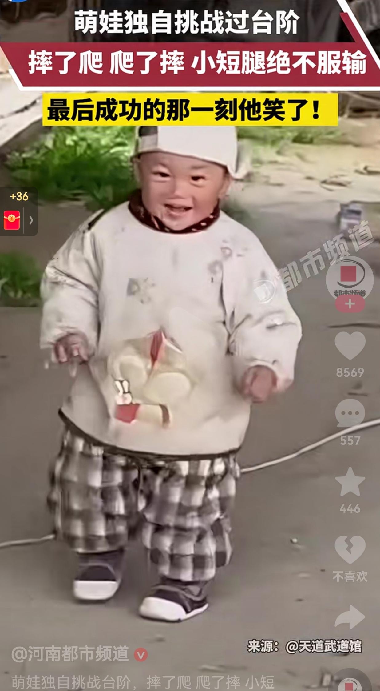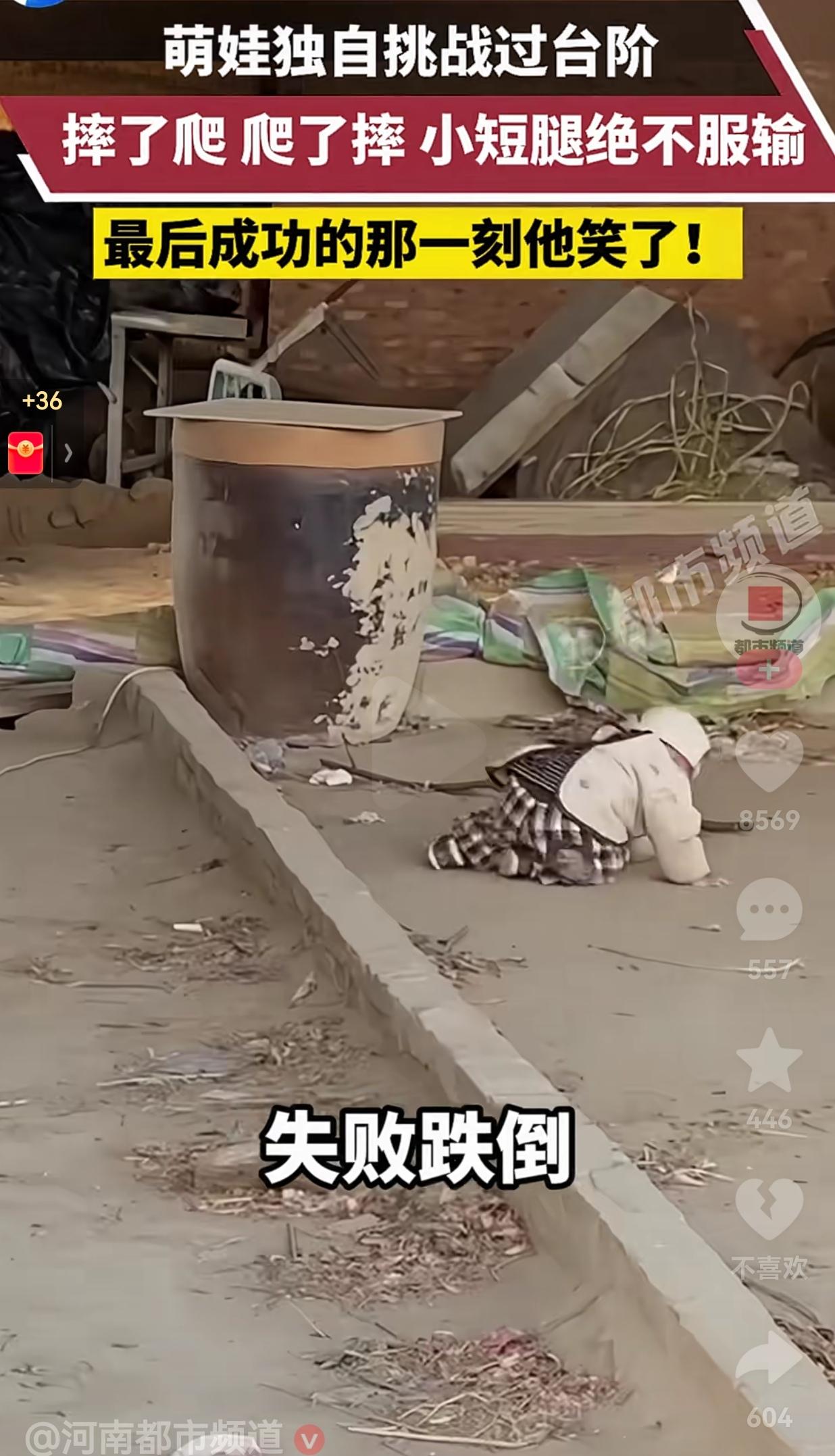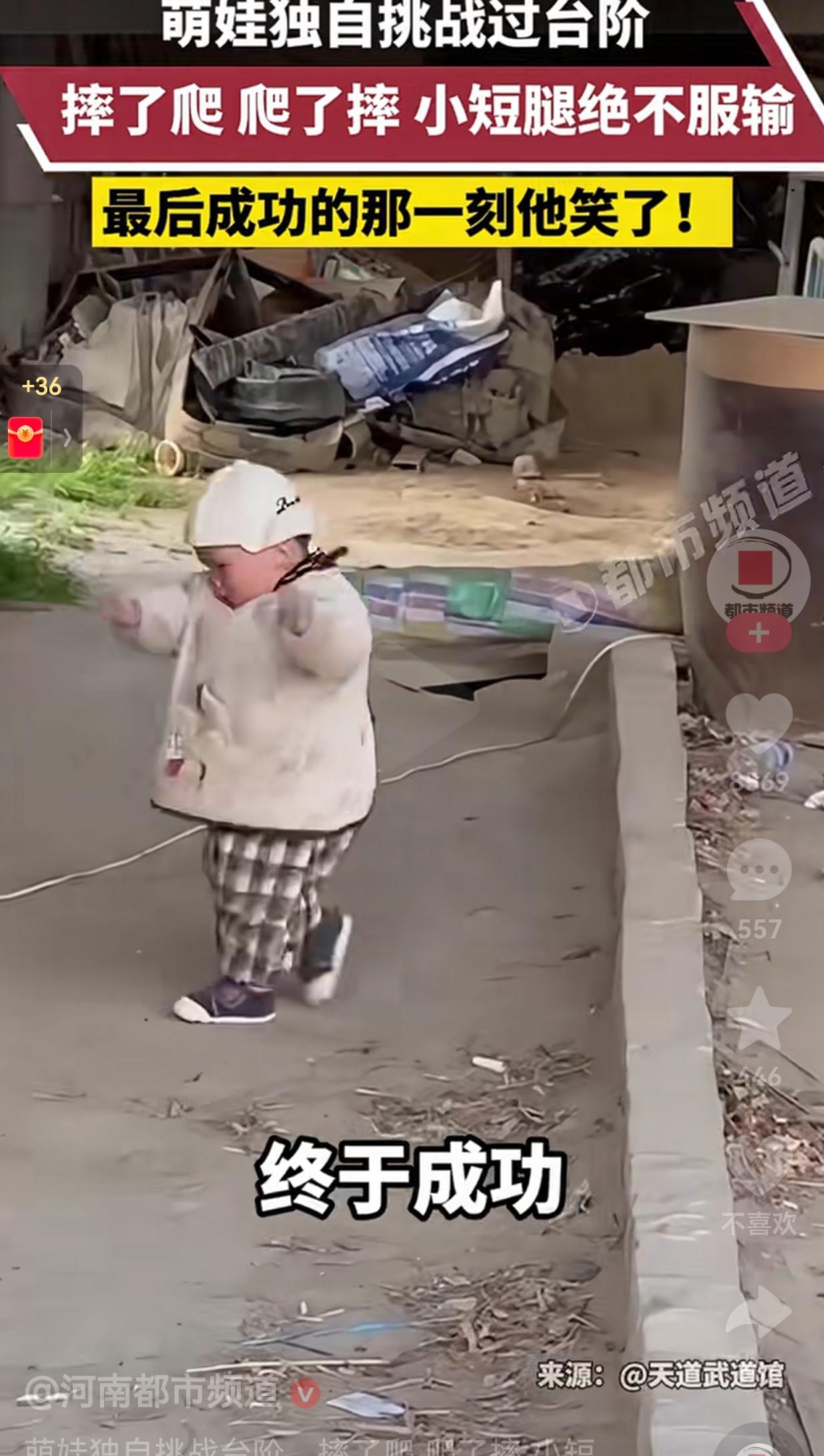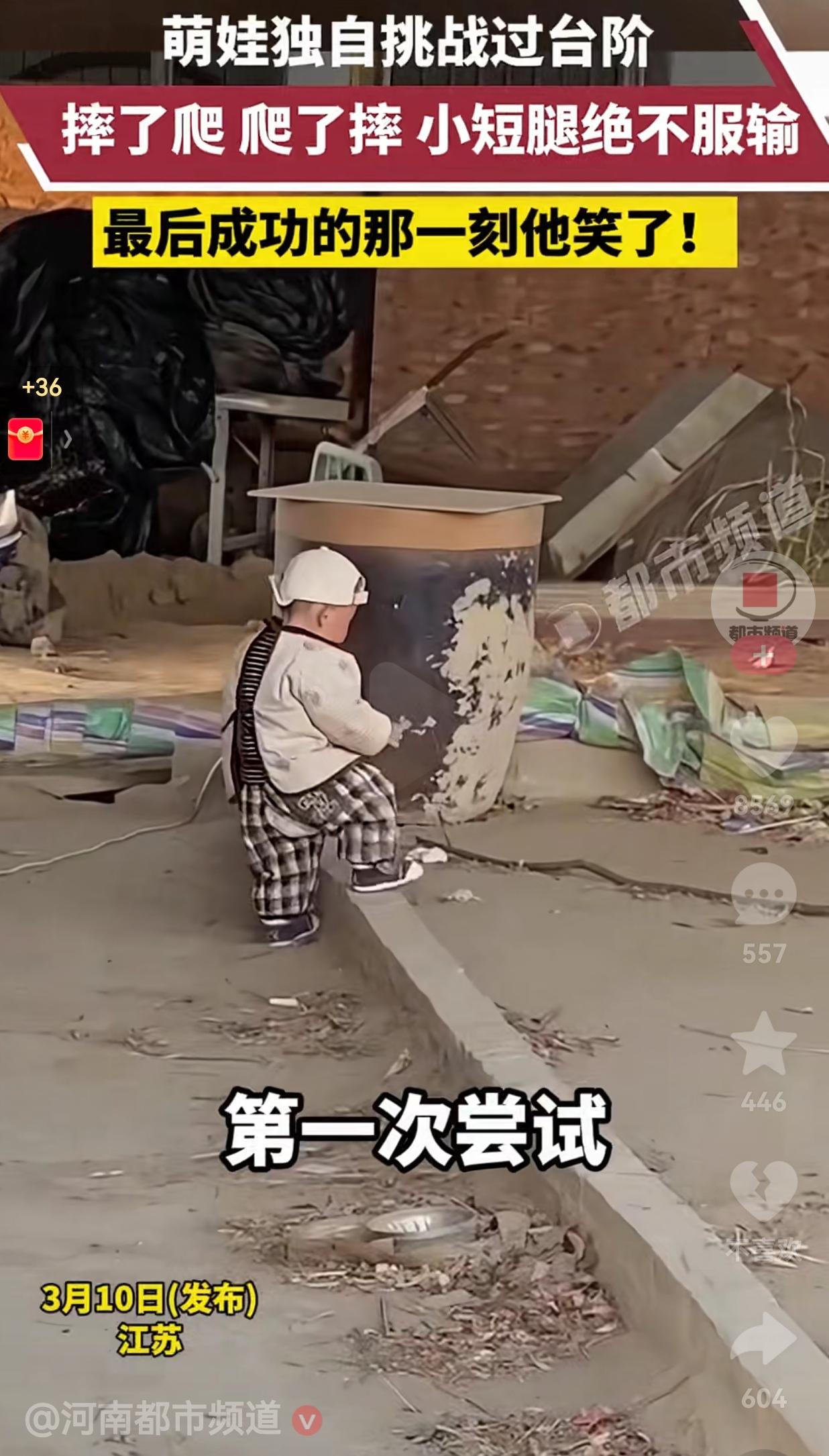 这孩子太有毅力了!情绪还很稳定,有一种不达目标,不罢休的态度,长大后必有出息! 江苏一小不点,穿着白外套、格子裤,戴着个小帽子,连路都走不稳,偏要跟这道水泥台阶死磕。 第一次刚抬腿就“啪叽”一下摔在地上,小短腿一蹬,自己撑着胳膊爬起来。第二次、第三次,一次比一次摔得狠,脸都贴在地上了,也没哭一声,爬起来拍拍灰,又挪到台阶边重新试。 直到第四次,他攥着小拳头,眼睛盯着台阶,慢慢把脚抬上去,身子一稳,终于跨了过去! 成功的那一刻,他张开胳膊蹦了两步,对着镜头笑得眼睛都眯成了缝,那笑容里全是骄傲,看得我心里又软又烫。 网友看到后评论说:“看着看着就哭了,我们长大了,却丢了小时候那股不服输的劲儿。” 也有的网友说:“生活再难,看看这个小朋友,就觉得没什么过不去的坎。” 还有的网友说:“愿我们历经世事,依然能像这个小朋友一样,跌倒了就再试一次。” 看到这个视频,我突然想起自己小时候学骑车,摔得膝盖流血,坐在地上哭着说“我不学了”,我妈蹲下来跟我说:“再试一次,就一次。” 后来我学会了,风从耳边吹过的时候,才明白“再试一次”这四个字,有多值钱。 现在的我们,太容易被“一次失败”打倒了。工作不顺就想辞职,感情受挫就说“再也不相信爱了”,连学个新技能,遇到点难题就刷起短视频逃避。 可这个连话都不会说的小娃娃,用他的实际行动告诉我们:摔疼了没关系,爬起来再试,只要不认输,就总有跨过去的那一天。 他不知道什么是“坚持”,也不懂什么是“成功”,他只是凭着一股本能,想跨过眼前这道小小的坎。可恰恰是这份最纯粹的“不服输”,比我们听过的所有大道理都更有力量。 我们总在教孩子要勇敢,可其实,孩子才是我们的老师。他用一次次跌倒和爬起,告诉我们:真正的成长,从来不是一帆风顺,而是摔了又爬,爬了又摔,直到笑着站在终点。 对此,你有什么看法呢?欢迎大家评论区讨论留言。