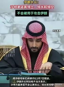 沙特承诺领土、领空、领水,不许任何国家用来攻击伊朗!沙特这也是自保吧?今日的伊朗,就是明日的沙特?伊朗之所以被炸,说白了就是石油惹的祸!沙特也是中东石油大国!整个中东,如果没有丰富石油资源,就不会有今天伊朗的战事吧?