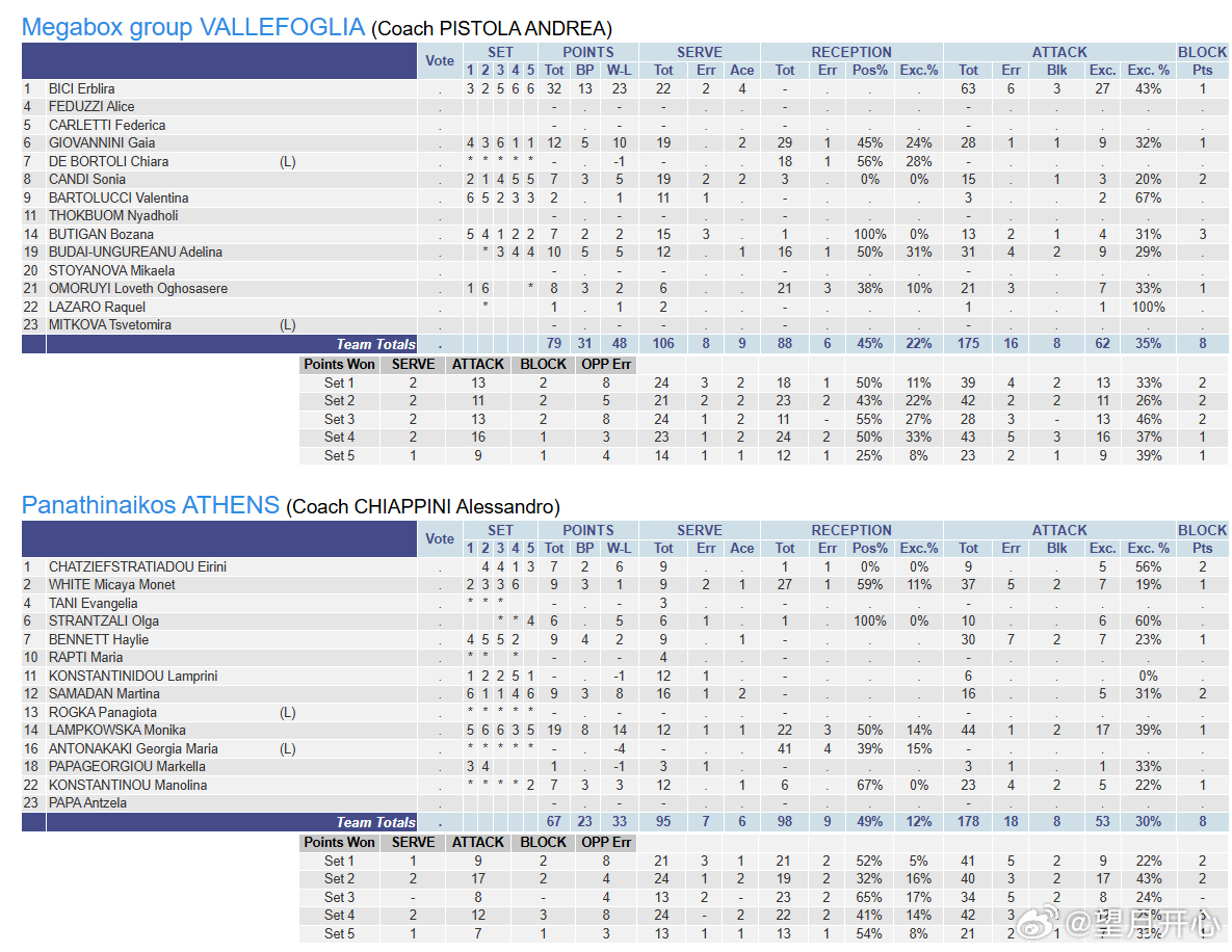 【欧挑杯决赛,瓦莱3-2帕纳辛奈科斯】欧挑杯女排决赛首回合,🇮🇹瓦莱福利亚3-2🇬🇷帕纳辛奈科斯,25-20/20-25/25-12/22-25/15-12;比奇32分(63扣27中6失误3被拦1拦4发)乔瓦尼尼12分(28扣9中1失误1被拦1拦2发,29一传1失误)翁谷雷努10分(31扣9中4失误2被拦1发,16一传1失误)奥莫鲁伊8分(21扣7中3失误1拦,21一传3失误)坎迪7分(15扣3中1被拦2拦2发)布蒂甘7分(13扣4中2失误1被拦3拦)