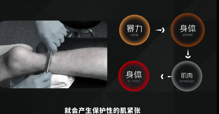 01. 暴力进行筋膜刀治疗时身体发生了什么——在对皮肤进行筋膜刀过度治疗时,皮下毛细血管会扩张甚至破裂产生大量充血。——皮下筋膜组织由于暴力刺激后引起进一步紧张,加重黏连。