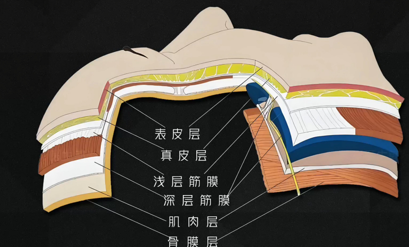02. 肌肉/筋膜为什么更紧张1、结构我们的身体从外到内,详细来说,它有解剖表皮层、真皮层、浅筋膜、深筋膜层、肌肉、骨膜。也就是说,筋膜层并没有那么深,在进行筋膜刀治疗时,并不能过度深压。