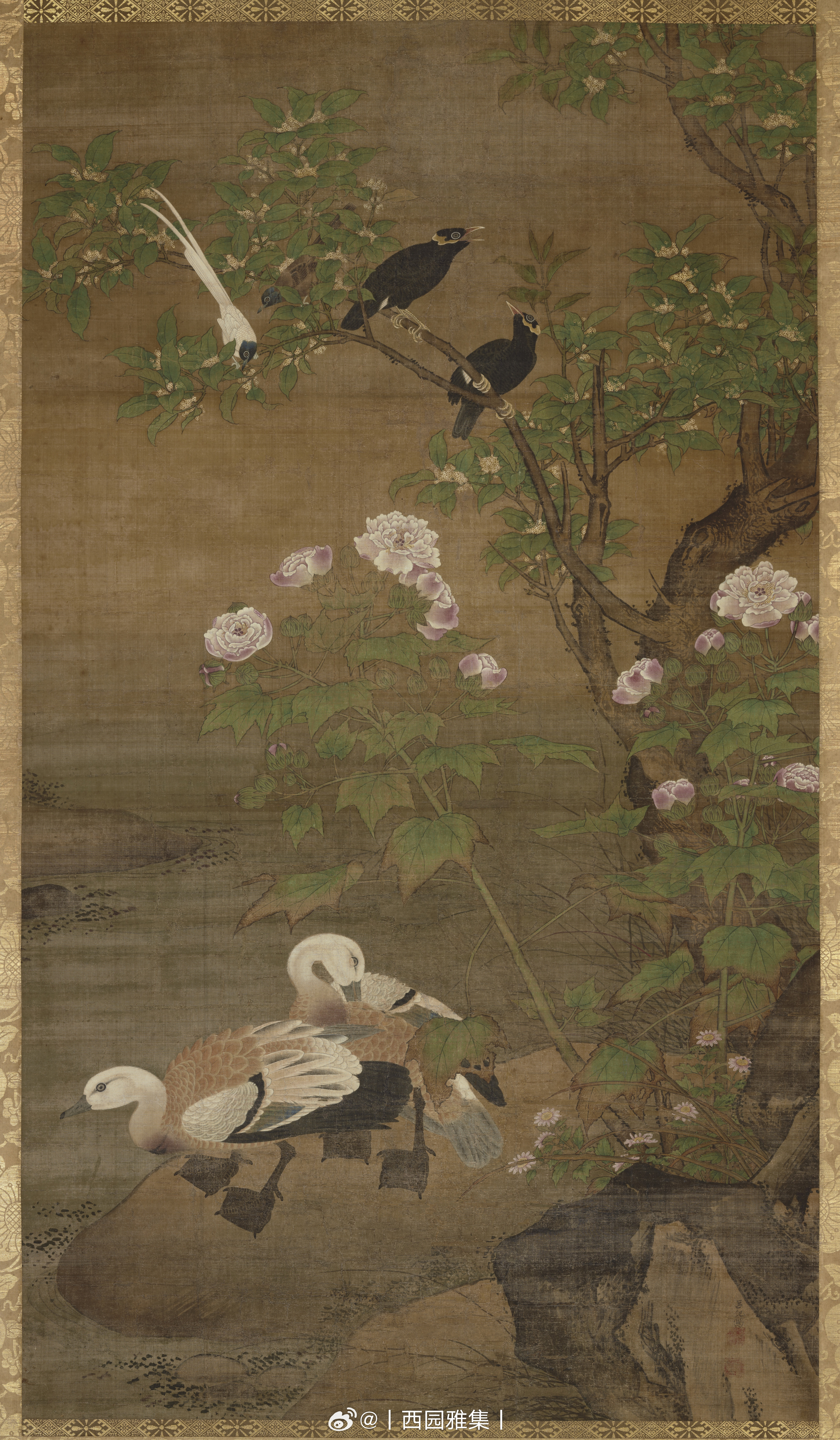 四季花鸟图共有四幅,春、夏、秋、冬各一幅,皆以鸳鸯、当季特色花、山石等,描绘出季节变化。画面上鸟儿生动可爱,花儿朵朵绽放,体现出每个季节都是那么多姿多彩。