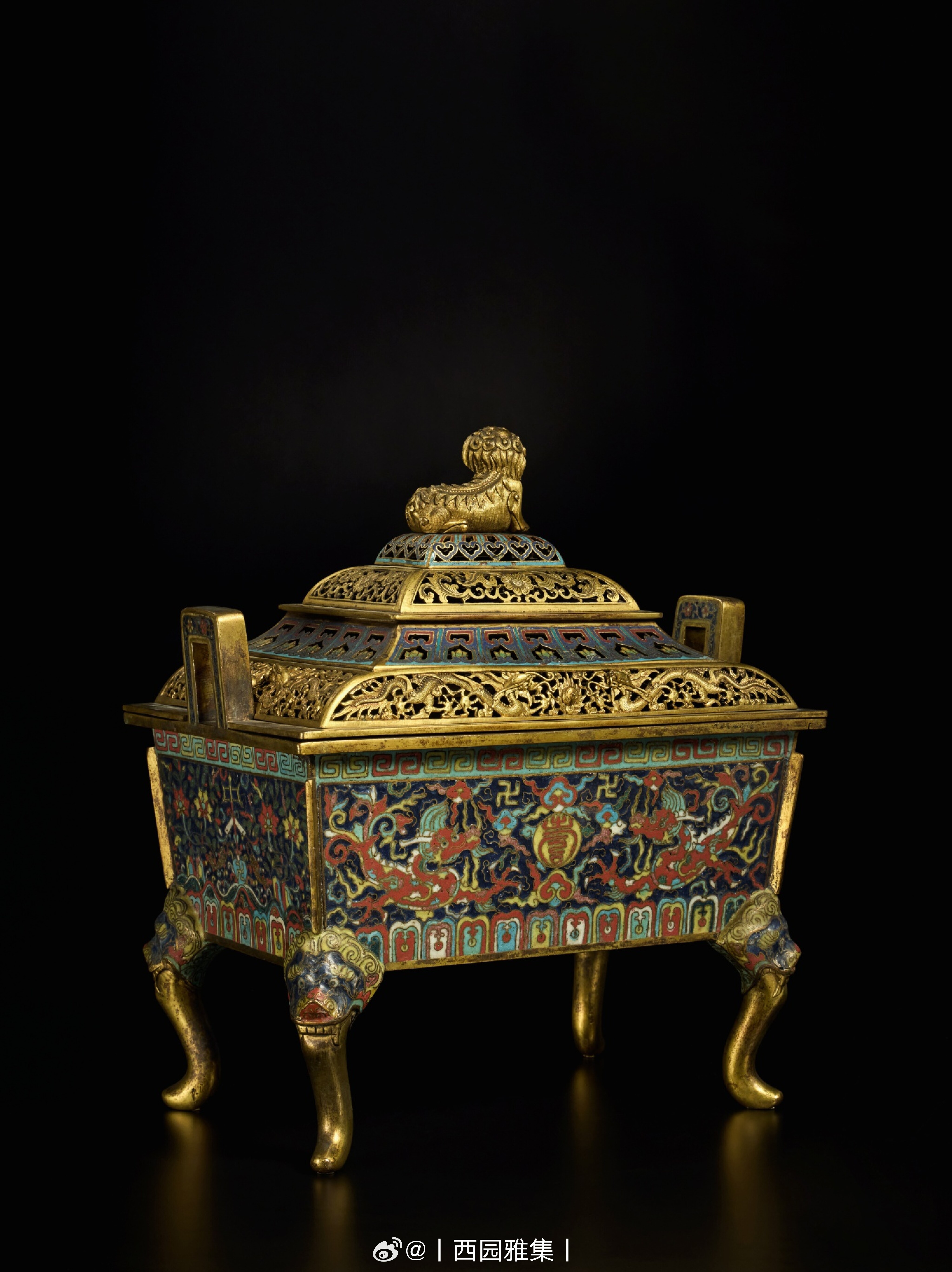 此御製香炉饰双龙捧寿纹,气度雍容,尺寸宏大,并带万曆款,珍稀罕有。器型取灵感自高古青铜方鼎,现知同式存世者仅见两种尺寸,本品属较大者,较小式例远为鲜见。尺寸较小之作例,可参见北京故宫博物院藏一炉,原应为万曆款,后覆景泰款(藏品编号新7035号),载于《故宫博物院藏品大系・珐琅器篇(上)》,北京,2010年,图版99;另一例配木盖及玉钮,两度售于纽约苏富比,分别为1976年1月17日,编号356以及2007年9月18日,编号136;再比一对例,售于伦敦苏富比1972年2月15日,编号5号;另有一例,出自英国利物浦纽伯里 Woolton House 收藏,曾售于伦敦苏富比1993年12月6日至7日,编号375,近期易手于香港邦瀚斯2023年11月29日,编号861。