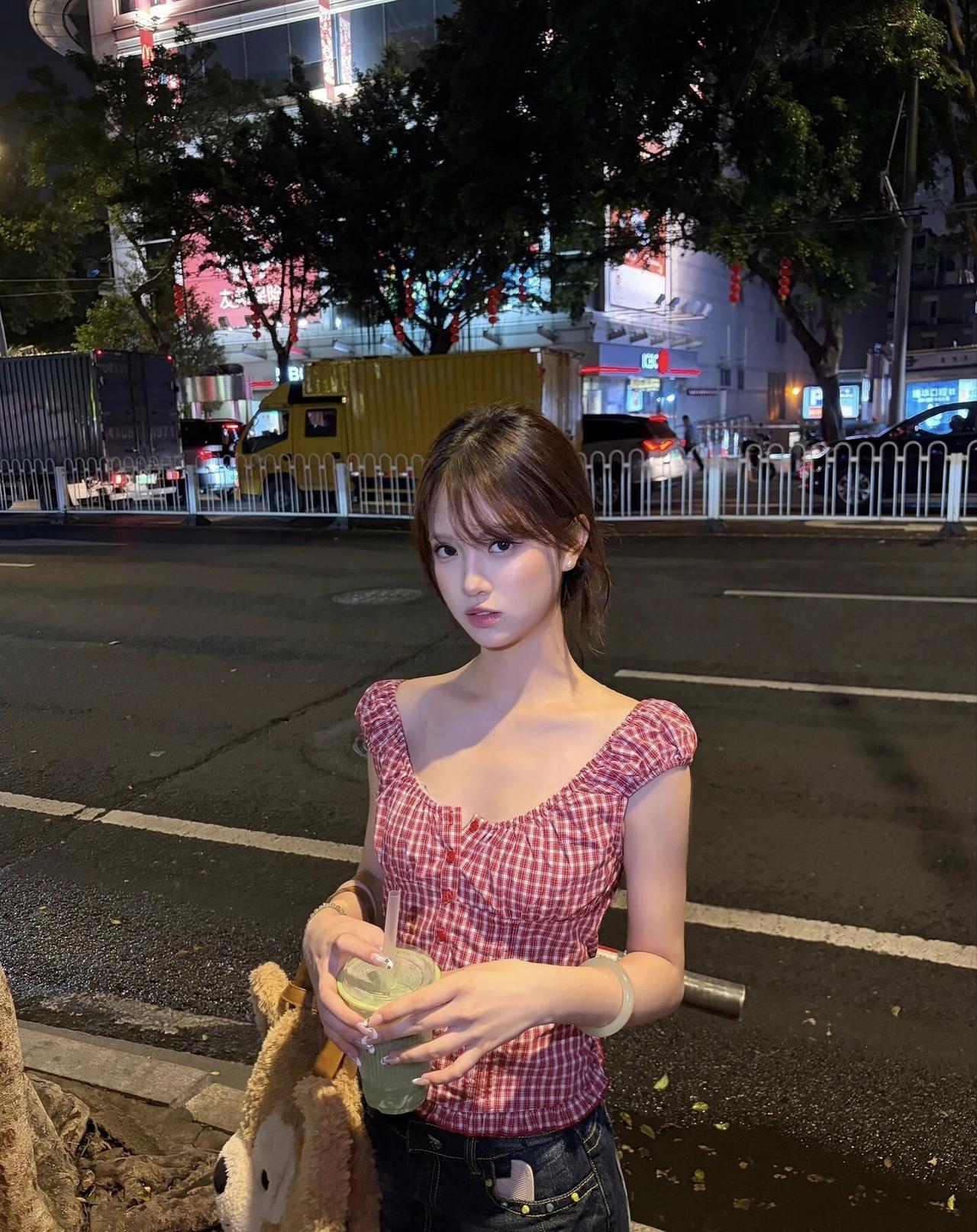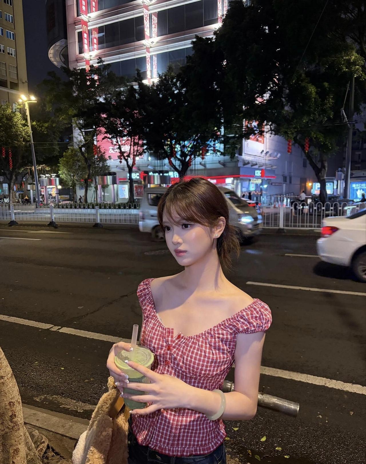 夜晚街头的少女,手捧奶茶,静待归人。