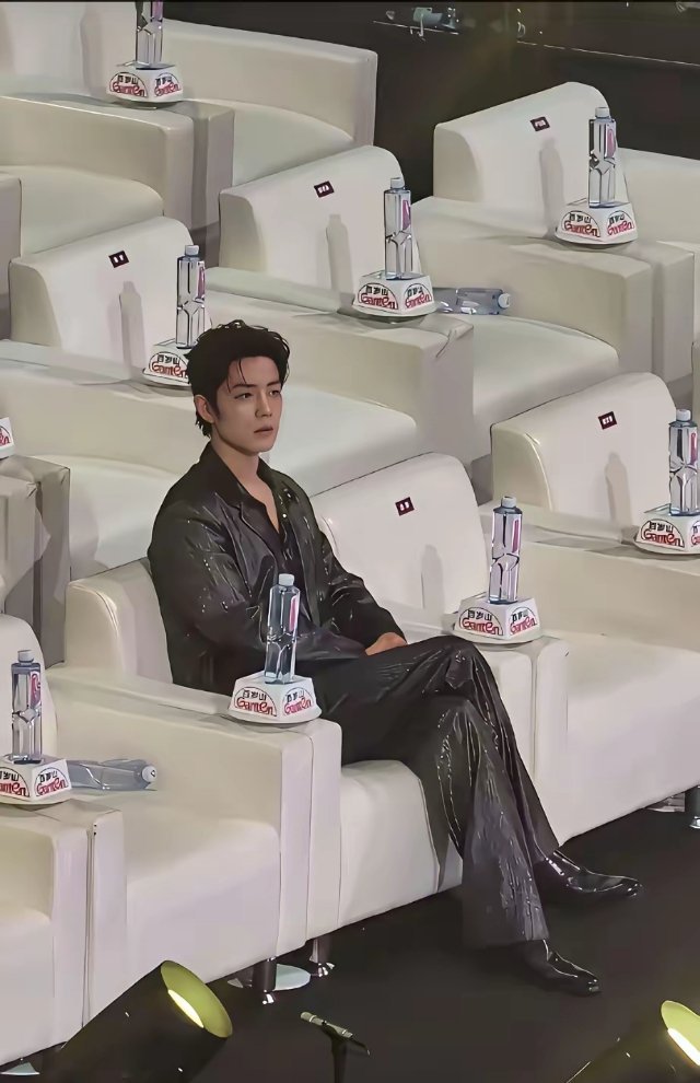 肖战尴尬了!他以为这是给他们喝的,没想到这矿泉水只是广告道具,拿不起来,举办方也许知道明星们不会喝这便宜矿泉水吧。