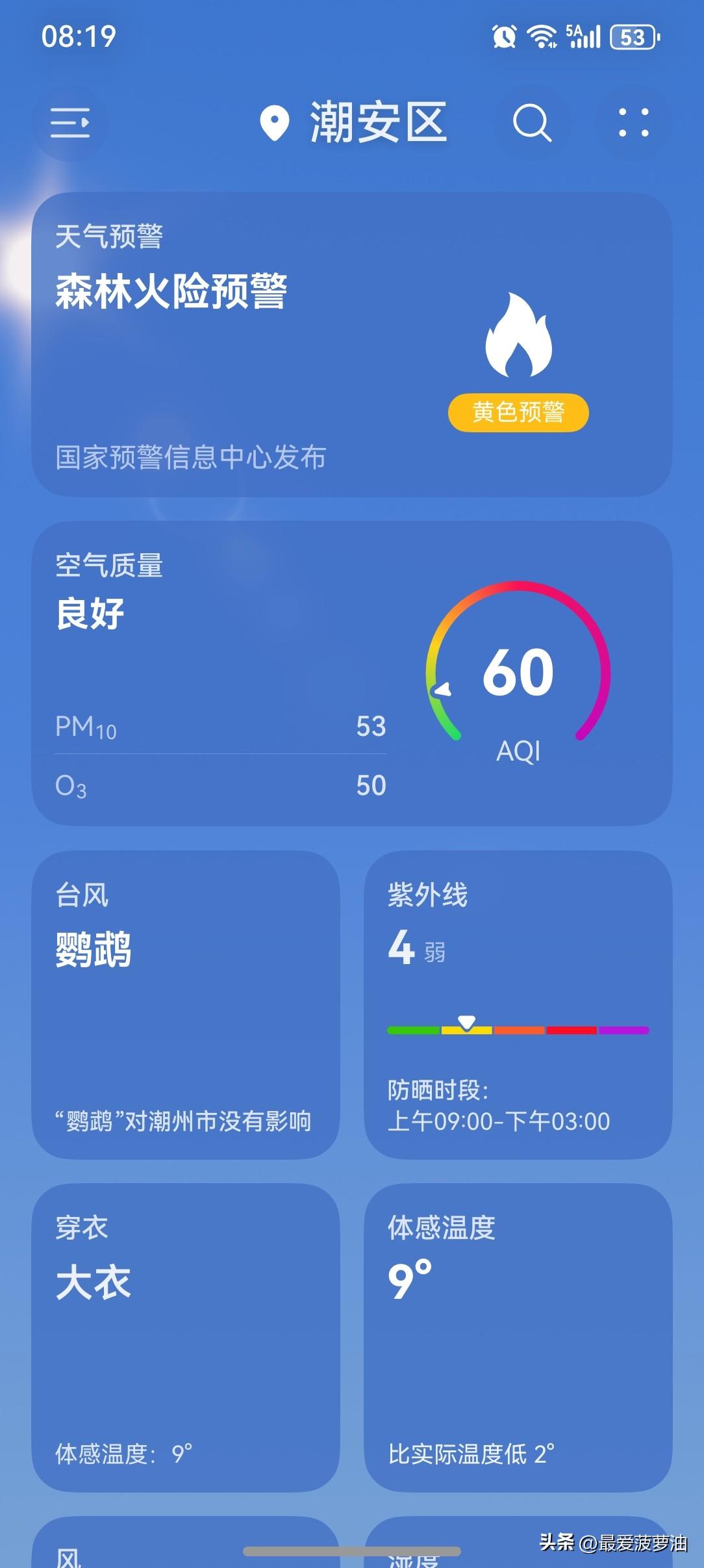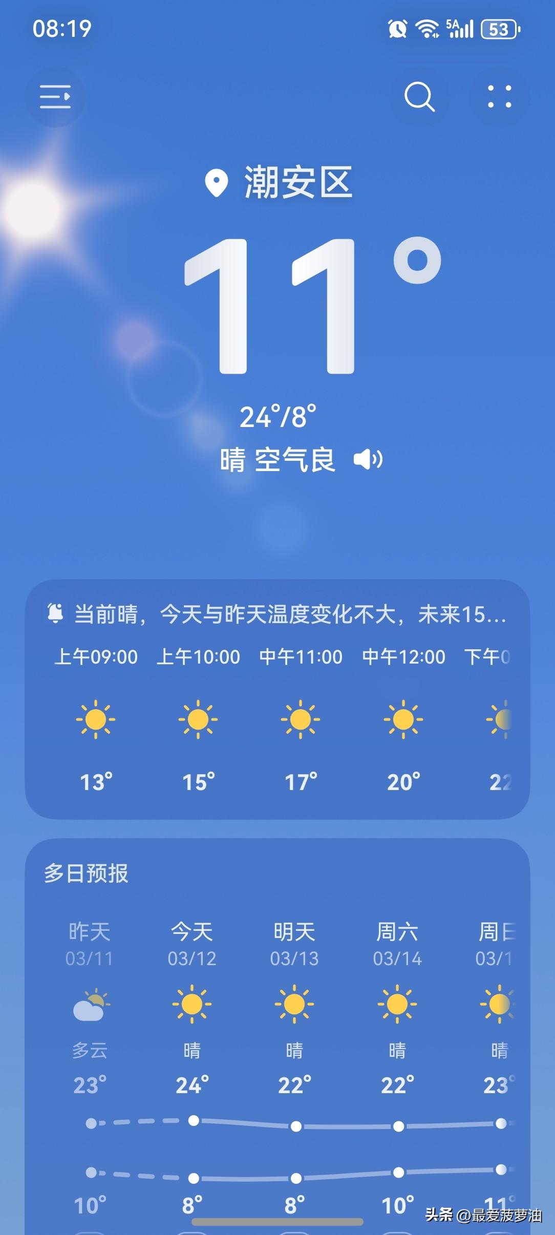 广东:持续晴朗干燥天气画风,昼暖夜冷,气温过山车又开始啦! 今明两天(12~13日),广东云量减少,大部晴间多云,受弱冷空气补充影响,昼夜温差大、早晚清凉;14日受东南气流影响,粤西云量增多。 今天(12日),潮州喜提一个大好晴天!气温8~24℃,此刻气温11℃,体感温度9℃。 又是喜提昼暖夜冷的节奏!白天的全天最高气温高达24℃,而全天最低气温只有8℃,温差16℃,气温过山车又开始啦! 一起来看看今天的天空吧!一大早太阳灿烂,阳光又返岗啦!继续送温暖来了,今天的气温又会蹭蹭地往上升! 不过,早上的气温依然有点低,外套还是得安排上! 近期昼夜温差大,每天都在为该怎么穿衣服而感到烦恼!穿多了怕热,穿少了怕冷,左右为难啊! 但是,总的来说,今天的天气还是值得拥有一个五星好评! 如此天气!元芳,你怎么看? [捂脸][大笑][我想静静][笑哭][捂脸][大笑][我想静静][笑哭]