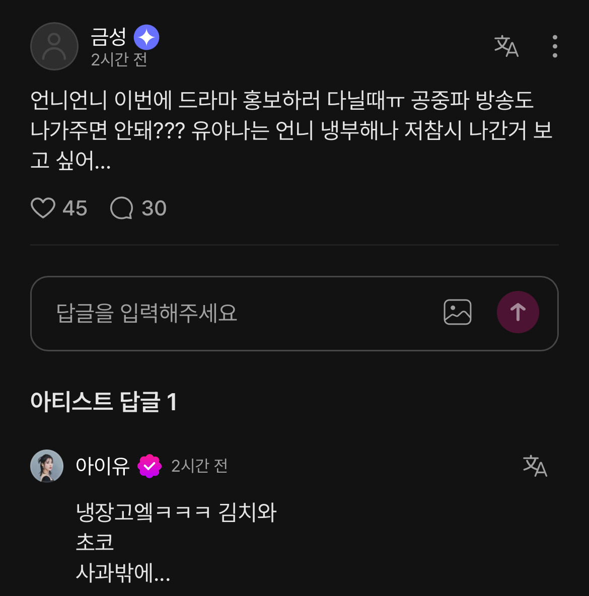 爱娜:姐姐这次电视剧宣传能多上点综艺吗?我想看你上那个拜托了冰箱IU:冰箱里除了泡菜、巧克力和苹果什么都没有……