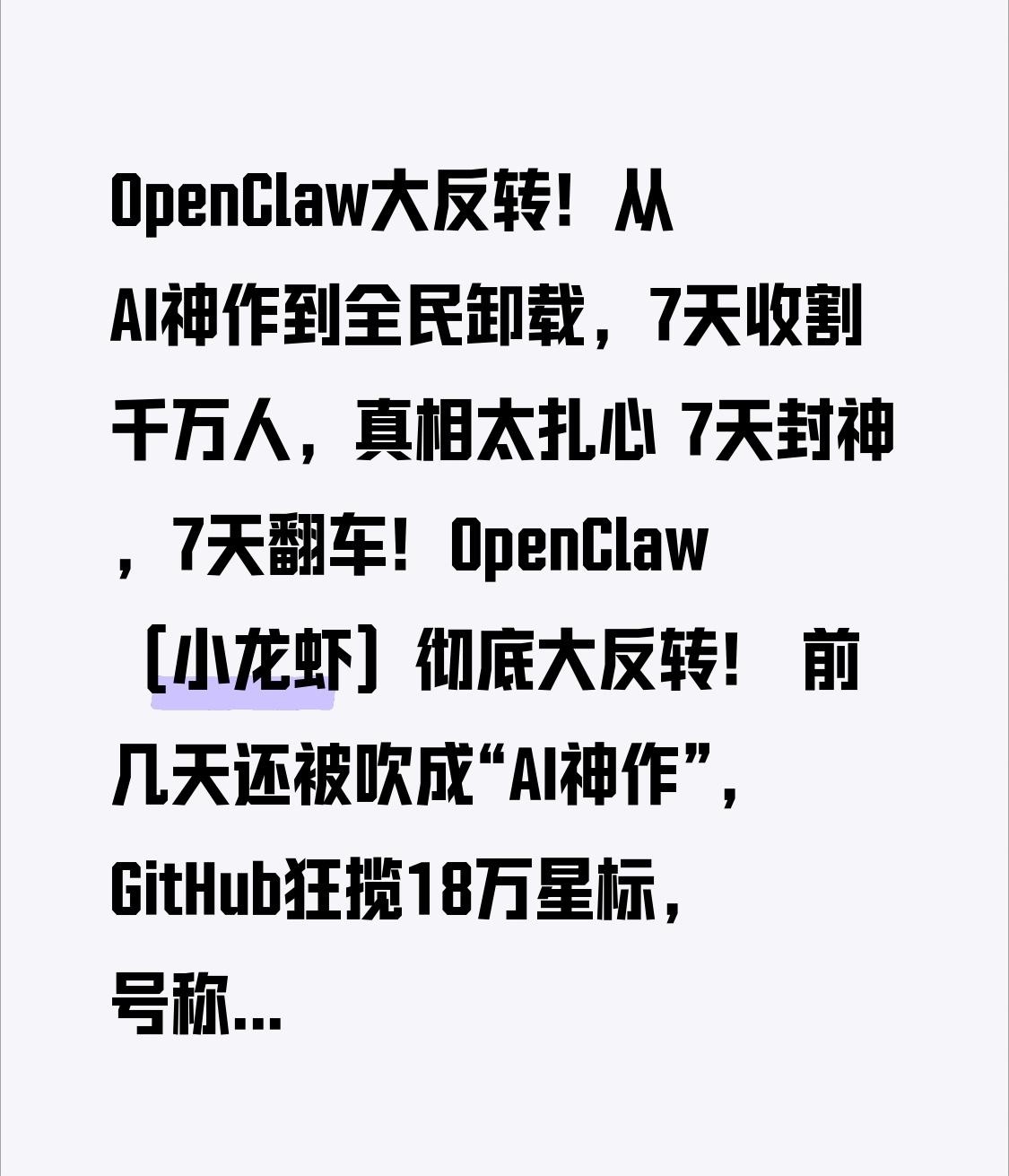 OpenClaw大反转!从AI神作到全民卸载,7天收割千万人,真相太扎心 7天封神,7天翻车!OpenClaw(小龙虾)彻底大反转! 前几天还被吹成“AI神作”,GitHub狂揽18万星标,号称能让AI替你干活、解放双手,无数人熬夜安装、花钱找人部署;如今却全网喊卸载,二手平台“专业卸载”服务爆单,从万人追捧到人人喊打,这背后到底藏着什么惊天骗局? 一开始,OpenClaw确实惊艳全网。 它号称本地部署、隐私安全,能打通微信、飞书,让AI自动写文案、做表格、操作电脑,被称为“打工人救星”,短短两周爆火出圈,连大厂都跟风推出部署服务。 可反转来得猝不及防! 先是谷歌突然封禁所有OpenClaw用户,永久剥夺AI服务权限,付费用户钱不退、号没了;紧接着工信部预警安全漏洞,相关概念股暴跌15%,高位接盘的散户血亏40%;更离谱的是,项目更名时10秒空窗期被黑产劫持,发行虚假代币收割1600万美元,无数人被骗光积蓄。 到最后大家才发现:所谓“AI神器”,要么是违规调用接口,要么是资本割韭菜的工具,普通人跟风安装,不仅没享受到便利,反而泄露隐私、损失钱财,最后只能花钱请人卸载止损。 OpenClaw的大反转,戳破了所有科技骗局的真相: 越是吹得神乎其神的“风口”,越可能是精心设计的陷阱;越是号称“免费、万能”的工具,背后越藏着收割的套路。 我们追求科技便利,不是为了被割韭菜;我们相信技术进步,不是为了沦为资本的猎物。 别再盲目跟风,别再被“一夜暴富、解放双手”的谎言洗脑,守住认知、守住钱包,才是普通人最该做的事。 你跟风安装过OpenClaw吗?有没有被收割?评论区说说!