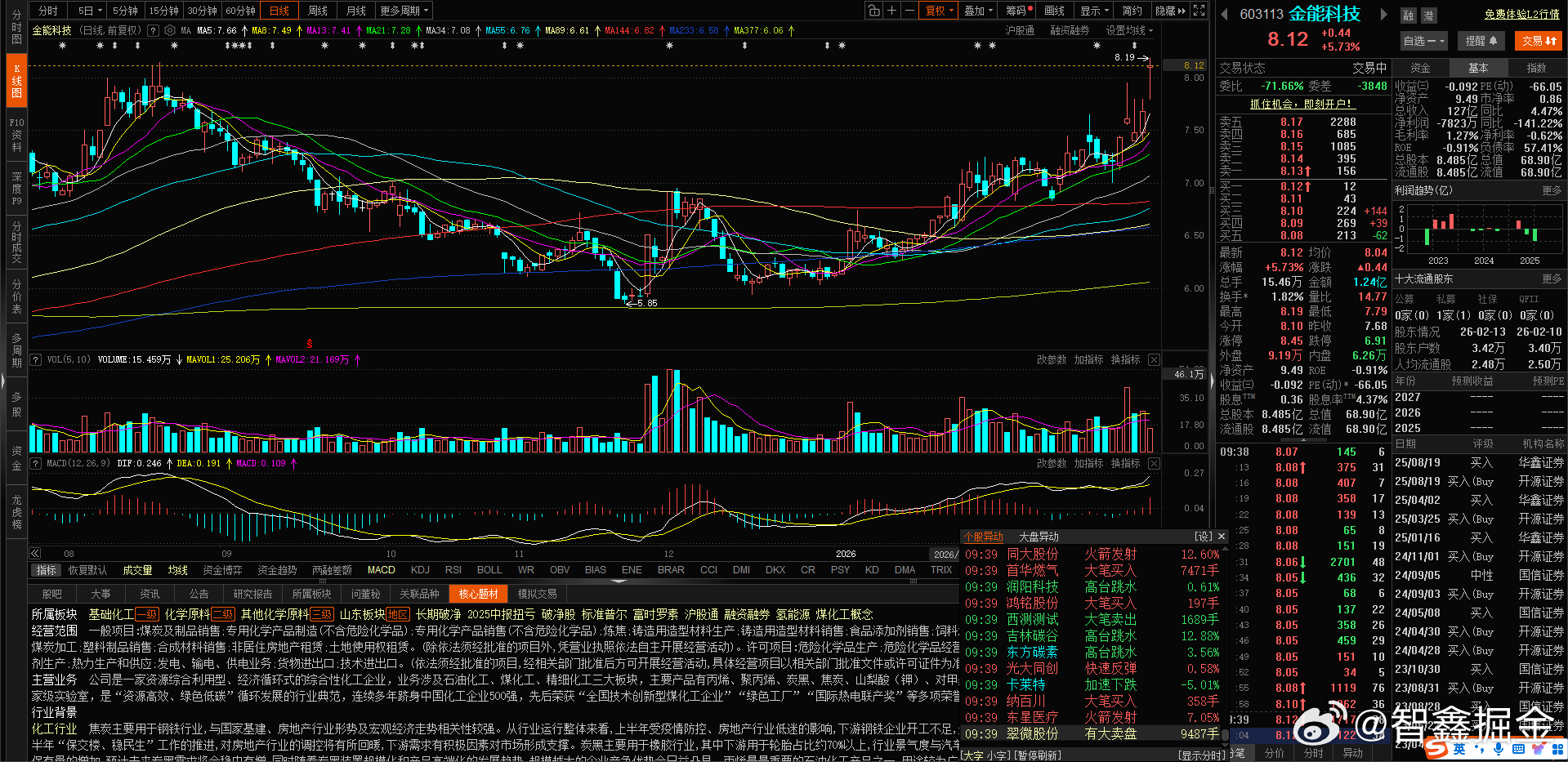 9日专栏系列给到同学们的 $金能科技 sh603113$ 冲高了 大家注意了