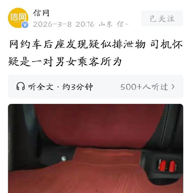 天津,网约车司机送完一对年轻男女后,往后座一看,竟发现后排坐垫上糊着一堆土黄色,稀稀的东西,看着就像人的排泄物。司机恶心的不得了,戴了两层口罩才收拾干净。恶心之余他觉得特别气愤,年轻人看着光鲜亮丽,怎么素质这么低,能干出这种事。于是,他联系平台要求赔偿,但平台的回复让他无语。 司机在天津开网约车好几年了,为人实在,开车也细心,平时对待乘客都客客气气,不管是帮忙搬行李,还是调整空调温度,都做得很周到。 他知道开网约车不容易,起早贪黑,一天跑十几个小时,就为了多挣点钱,养活一家人,所以格外爱惜自己的车,每天收车后都会把车内打扫得干干净净,连角落的灰尘都不会放过。 事发那天下午,司机正在市区接单,接到一个订单,乘客是一对二十出头的年轻男女,目的地是郊区的一个网红民宿。 接单后,司机很快就赶到了约定地点,两人上车时,司机还主动热情地打招呼,帮他们把随身的背包放到了后备箱,一路上也没多说话,安安静静地开着车,生怕打扰到两人。 一路上,这对年轻男女有说有笑,偶尔还会吃点零食、喝点饮料,司机也没在意,毕竟乘客在车内吃东西是常有的事,只要不乱扔垃圾、不弄脏车辆,他都不会多说什么。 大概开了四十多分钟,车子到达了目的地,两人付了钱,说了一句“谢谢”,就匆匆下了车,连后备箱的背包都是司机提醒后,才回来拿的。 看着两人牵手走进民宿的背影,司机还感慨了一句,现在的年轻人真幸福,有空就出来旅游放松。可他刚准备接单离开,习惯性地往后排看了一眼,瞬间就愣住了,一股刺鼻的异味扑面而来,差点让他吐出来。 后排坐垫的中间位置,糊着一堆土黄色、稀稀的东西,黏糊糊的,还沾着几根头发,一眼看上去,就像是人的排泄物。司机赶紧下车,绕到后排,打开车门,异味更浓了,他下意识地捂住鼻子,胃里翻江倒海,恶心的直皱眉。 他开网约车这么多年,见过乘客在车内乱扔垃圾、打翻饮料的,甚至见过醉酒乘客吐在车内的,但从来没见过这么过分的,竟然把排泄物弄在坐垫上,简直是刷新了他的认知。司机气得浑身发抖,这不仅恶心,还得花时间、花钱去清理,更耽误他接单挣钱。 附近没有洗车店,司机只能从车上拿出备用的口罩、手套和消毒水,先戴上两层口罩,再戴上手套,一点点地清理那些脏东西。 清理的过程中,异味一直围着他,好几次他都差点吐出来,只能停下动作,深呼吸平复一下,再继续清理,前前后后花了将近一个小时,才把坐垫清理干净,又用消毒水把整个后排喷了好几遍,才算勉强遮住异味。 清理完后,司机看着自己沾满污渍的手套,越想越气,他觉得自己不能就这么算了,这对年轻男女的行为,不仅弄脏了他的车,还耽误了他的时间,影响了他接单,理应赔偿他的清理费和误工费。 于是,他赶紧打开网约车平台,找到订单记录,联系了平台客服,把事情的来龙去脉说了一遍,还拍了坐垫清理前后的照片和视频,要求平台介入,让那对乘客赔偿他的损失。 客服一开始还很客气,听完他的诉求后,说会尽快核实情况,联系乘客了解情况,让他耐心等待,承诺会在24小时内给出回复。司机虽然心里着急,但也只能耐心等待,他想着,证据确凿,平台肯定会公正处理,让乘客赔偿他的损失。 可他等了整整一天,都没等到平台的回复,无奈之下,他又再次联系了平台客服,询问事情的进展。这一次,客服的态度变得敷衍起来,只说已经联系过乘客,但乘客否认是自己弄的,说下车时车内是干净的,平台也没有办法强制乘客赔偿,只能给司机发放一张20元的洗车优惠券,作为补偿。 这个回复让司机彻底无语了,他花了一个多小时清理,耽误了好几个订单,损失的误工费和清理费就不止20块钱,平台就用一张20元的洗车优惠券打发他,而且还不追究乘客的责任,这让他难以接受。 他反复跟客服沟通,说自己有照片和视频为证,还有行车记录仪的录音,能证明那对乘客下车后,车内才出现脏东西,但客服始终坚持,无法强制乘客赔偿,只能给出这样的补偿。 司机气得挂了电话,心里满是委屈和无奈。他知道,自己只是一个普通的网约车司机,没有什么后台,面对平台的敷衍,他根本没有办法。后来,他把事情的经过发到了网上,还附上了照片和视频,没想到很快就引发了网友的热议。 很多网友都为司机打抱不平,觉得那对年轻男女太没素质,光鲜亮丽的外表下,藏着一颗肮脏的心,就算是不小心弄脏了车辆,也应该主动承认,承担相应的责任,而不是选择否认和逃避。还有网友吐槽平台的做法太敷衍,根本不重视司机的权益,只顾着维护乘客,这样只会寒了司机的心。 我觉得,素质从来都不是靠外表来衡量的,光鲜亮丽的外表,不代表有高尚的品德,真正的素质,体现在一言一行中,体现在懂得尊重别人、体谅别人。 那对年轻男女的行为,不仅是对司机的不尊重,也是对公共物品的不珍惜,更是自身素质低下的体现,他们或许觉得自己无所谓,却不知道,自己的一时任性,给别人带来了多大的麻烦和损失。