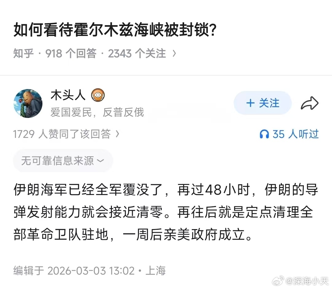 伊朗润人又把美国给战忽了几个月前,伊朗确实发生了颜革,按照伊朗润人给出的数据,又是什么几百万人上街之类的。围观过香港黑暴风波,都知道这些数据是怎么编的。颜革失败后,伊朗润人又告诉美国,被杀了几万人,现在家家戴孝,只要王师一到伊朗民众就会立即带路。所以开打第一天,川宝就信心满满发帖说会换新政府(亲美政府),毕竟润人说得有模有样。结果打了一周多了,伊朗越打越强硬,伊朗高层里的中间或者亲美派竟然被炸死了,民众更是团结起来。那些庆祝的视频,全是伊朗国外的,也就是润人自己拍的。跳进泥潭里,损失了上百亿之后,回过神来,美国发现被润人骗了……美国以色列出现分歧伊朗证实袭击霍尔木兹海峡船只