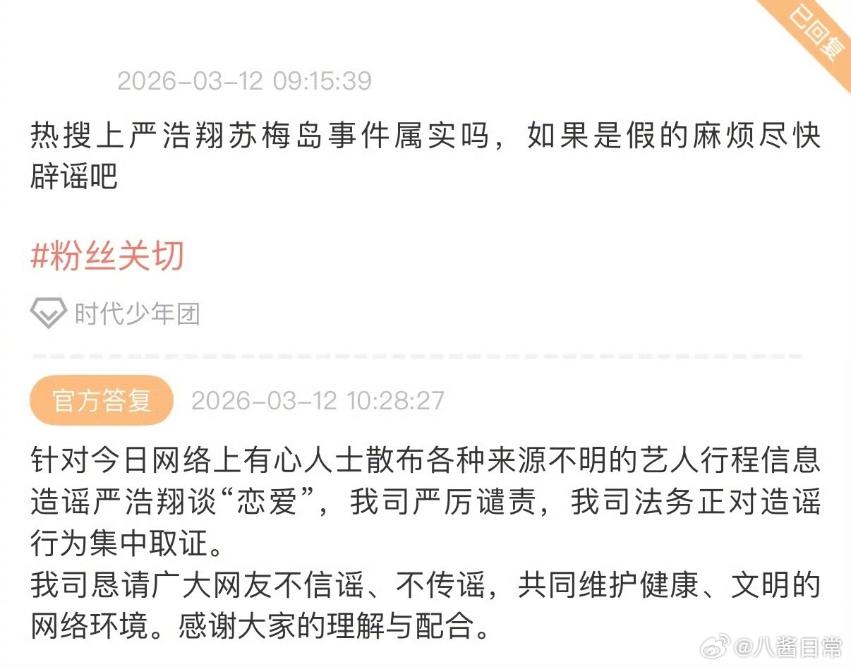公司辟谣严浩翔恋情严浩翔苏梅岛时代峰峻辟谣严浩翔谈恋爱
