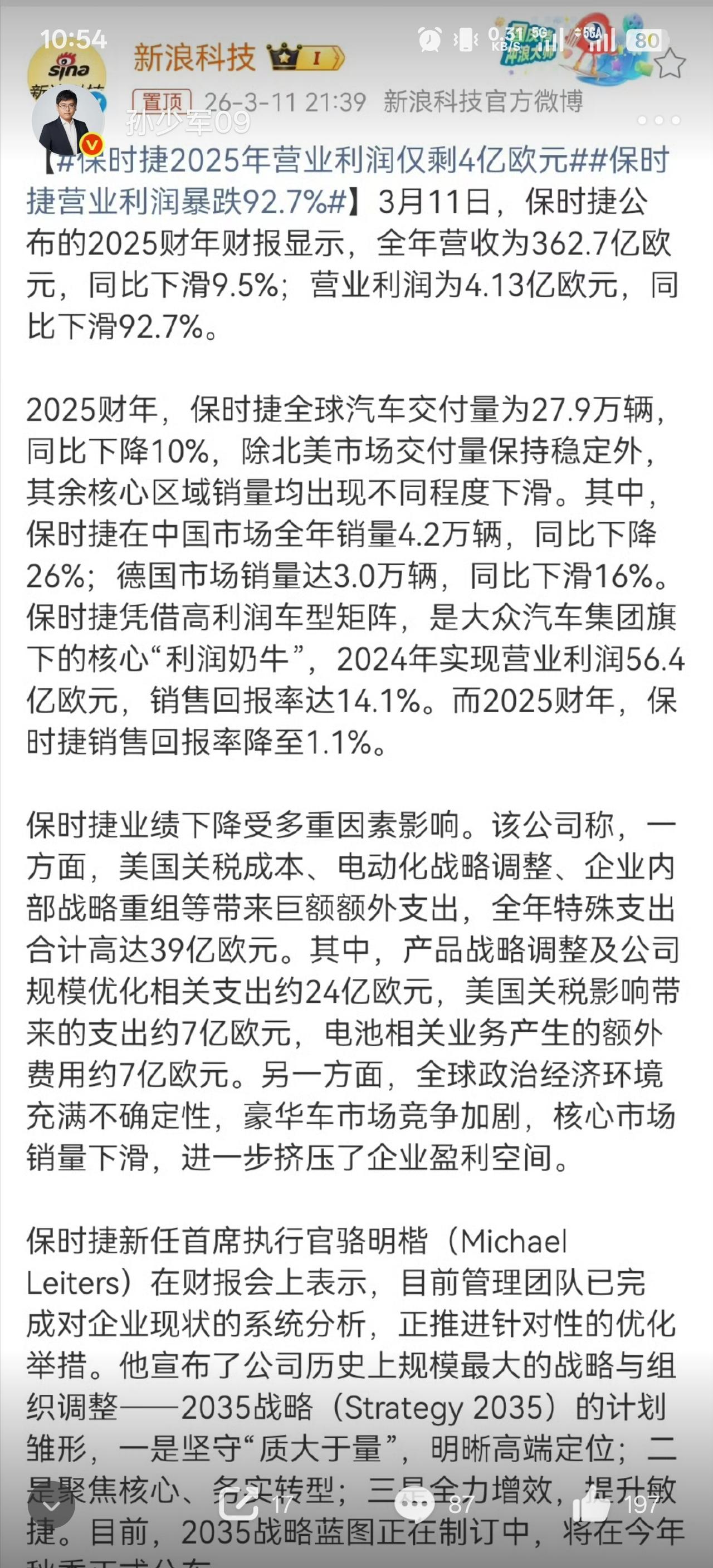 保时捷这利润亏得真夸张!直接砍到脚脖子的 90%! 在保时捷,其实中国算是它最大的一个市场,现在中国市场销量的断崖式下滑,也就使得保时捷今年乃至接下来的几年日子都不好过了! 是这些年的谷底,但也是下一个十年的巅峰了! 有网友说,建议和华为合作搞个保界!哈哈哈哈,真的笑死!