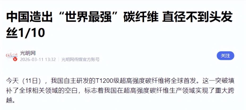 日本怎么也没想到,中国也能搞出T1200碳纤维,更关键的是,咱们不是实验室里搞出几根样品发个论文,而是直接搞出了百吨级的量产。 在高端材料领域,T1200级碳纤维一直有着“黑色黄金”的美誉,它是当前强度等级最靠前的高端材料之一,更是航空航天、国防军工等关键领域离不开的核心刚需品。 这种细如发丝的材料,直径还不到一根头发丝的十分之一,却有着超乎想象的硬核性能——拉伸强度突破8000兆帕,同等粗细下,它能承受的拉力是普通钢材的十倍,重量却只有钢材的四分之一,一万两千根组成的纤维束,理论上能轻松吊起两架C919大飞机,就连-269℃到1300℃的极端环境,它都能稳定工作。 过去几十年,高端碳纤维市场一直被日本东丽、美国赫氏等少数企业牢牢垄断,他们不仅掌控着核心技术,还对中国实行严苛的技术封锁和设备禁运,哪怕是有钱,我们也买不到最顶级的T1200级碳纤维。 在这样的困境下,国内企业只能从低端碳纤维做起,高端领域长期被“卡脖子”,始终难以突破日美的技术壁垒。 日本东丽更是一度底气十足,认为中国想要突破T1200级碳纤维技术,至少还需要五年时间。 2023年,日本东丽高调全球首发了实验室研发的T1200碳纤维样品,宣称其强度比之前的产品提升了10%以上,一时间引发全球关注,不少人都以为日本会继续垄断高端碳纤维市场。 可谁也没想到,三年时间过去,东丽的T1200碳纤维依旧停留在实验室阶段,量产计划迟迟没有动静。 究其原因,就是东丽的技术过于依赖实验室里的微观精细调控,靠着顶尖显微镜在纳米层面控制材料构造,本质上就是“手工打造”,想要实现工业化量产,根本无法解决稳定性和良品率的难题。 就在日本卡在量产关口难以突破的时候,中国悄悄交出了一份惊艳全球的答卷——我们不仅成功研制出了T1200级碳纤维,更关键的是,咱们不是实验室里搞出几根样品发个论文,而是直接搞出了百吨级的量产。 这一点,是日本怎么也没想到的,他们引以为傲的技术优势,就这样被中国彻底打破。 这项突破并非偶然,背后是中国建材集团旗下中复神鹰团队的默默攻坚。 他们啃下了原丝、碳化、上浆全链条的技术硬骨头,牵头研发出了名为SYT80的T1200级碳纤维,并在2026年3月正式发布,百吨级产线实现稳定投产。 更值得一提的是,这款国产T1200碳纤维的核心设备100%实现国产,良品率超过98%,全流程不依赖任何国外技术,工程化性能更是稳居全球第一,彻底摆脱了对国外技术的依赖。 中国之所以能一举突破量产难关,靠的不是一两台昂贵的实验设备,而是多年积累的成熟工业制造体系和丰富的工艺经验,我们跳过了漫长的试错阶段,直接直奔工业化量产,完美解决了东丽难以攻克的稳定性难题。 这也让中国成为全球首个能把T1200级碳纤维做到百吨级产能的国家,彻底打破了日本在超高强度碳纤维领域的垄断地位。 随着国产T1200碳纤维的批量生产,它的价值开始在各个领域落地生根。 在国防军工领域,它为六代机研发提供了核心支撑,一体化机身制造减少了拼接缝和铆钉,既减轻了机身重量,又大幅提升了隐身性能,让战机的机动性、载弹量和作战半径都得到显著提升,彻底补齐了我国战机材料的短板。 在航空航天领域,它能大幅减轻火箭、卫星的重量,提升有效载荷,降低航天发射成本,还能抵御太空极端环境,为深空探测任务提供了可靠保障,让我们彻底摆脱了高端航天材料进口依赖。 在民用高端领域,国产T1200碳纤维同样发挥着重要作用。 海上风电的超大尺寸叶片,有了它的加持,强度得到充分保障,成本直接降低30%;新能源汽车用它打造车身和电池结构,能减重200到300公斤,电耗降低20%,续航里程大幅提升;氢能高压储氢瓶用它缠绕,耐压性拉满,为清洁能源普及提供了有力支撑。 如今,全球高端制造企业纷纷转向中国,寻求稳定的T1200碳纤维供应渠道,曾经垄断市场的日本东丽,不仅没能实现量产计划,还失去了市场主导权。 中国不仅实现了从T300到T1200碳纤维的全覆盖,产能稳居全球第一,更在全产业链上掌握了主动,从原丝生产到核心设备,全部实现自主可控。