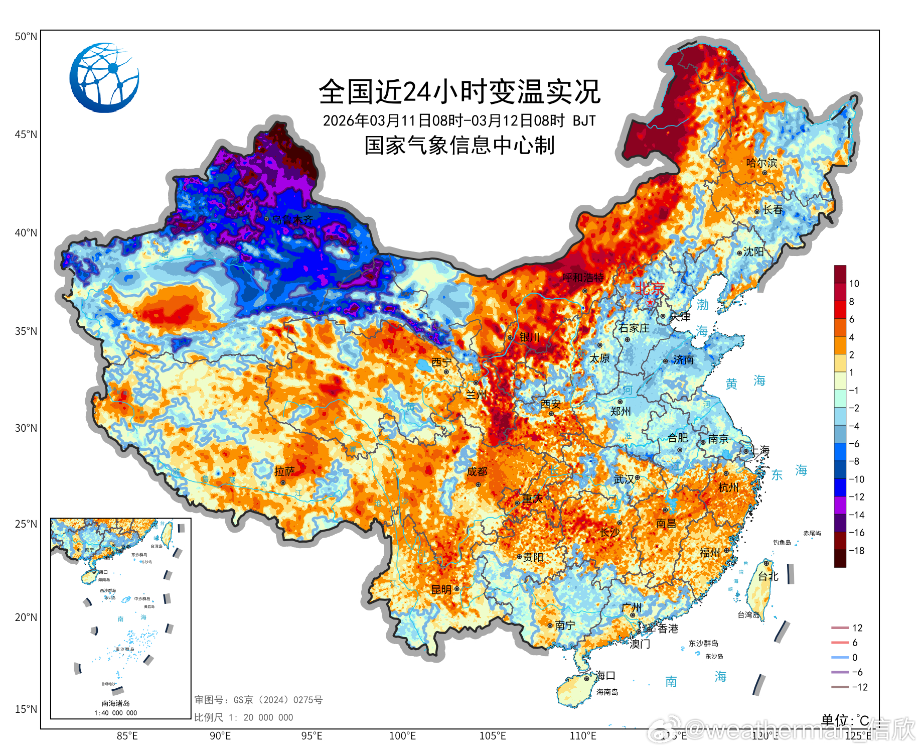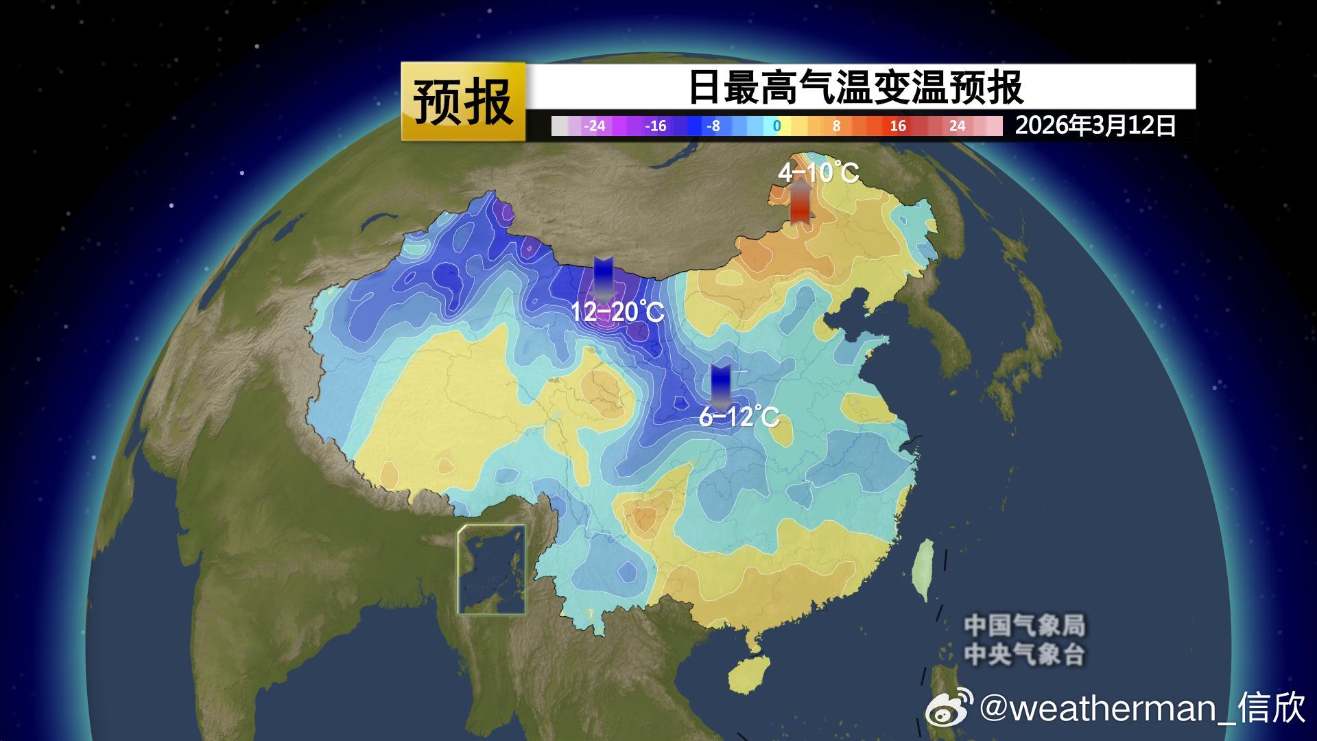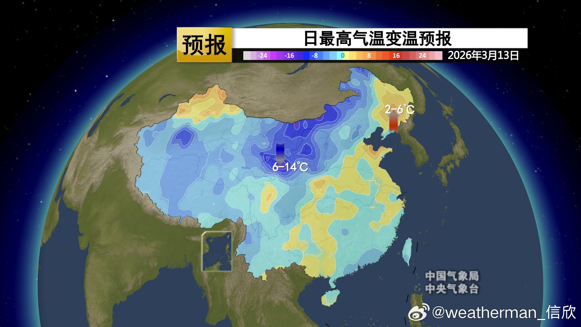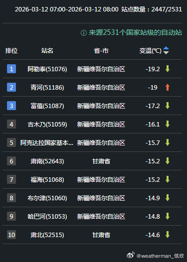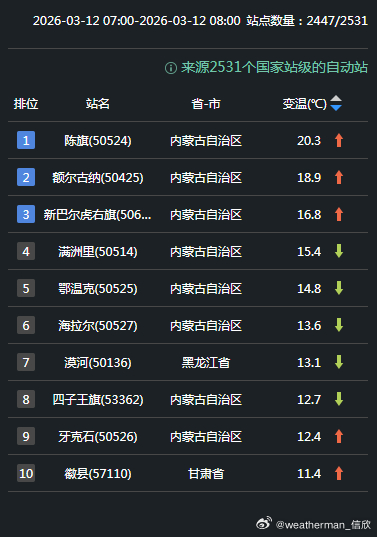 【气温波动】今晨因为冷空气影响,新疆北部、甘肃西部多地降温超10℃,新疆阿勒泰降19.2℃,为08时全国降温最强站点。而在冷空气到来前,南风暖平流+云层遮盖保温,内蒙古东部大幅升温。陈巴尔虎旗升20.3℃,为08时全国升温最强站点。今明2天,冷空气继续东移,强降温也会向东转移。昨天气温破纪录的甘肃张掖,今天下午14时对比昨天14时,大概率降温会超20℃。