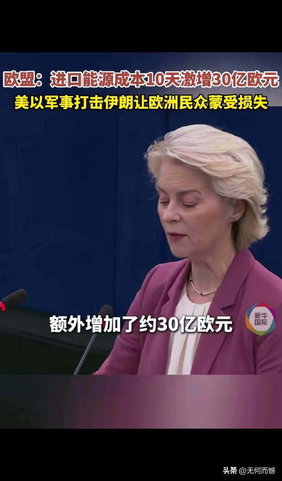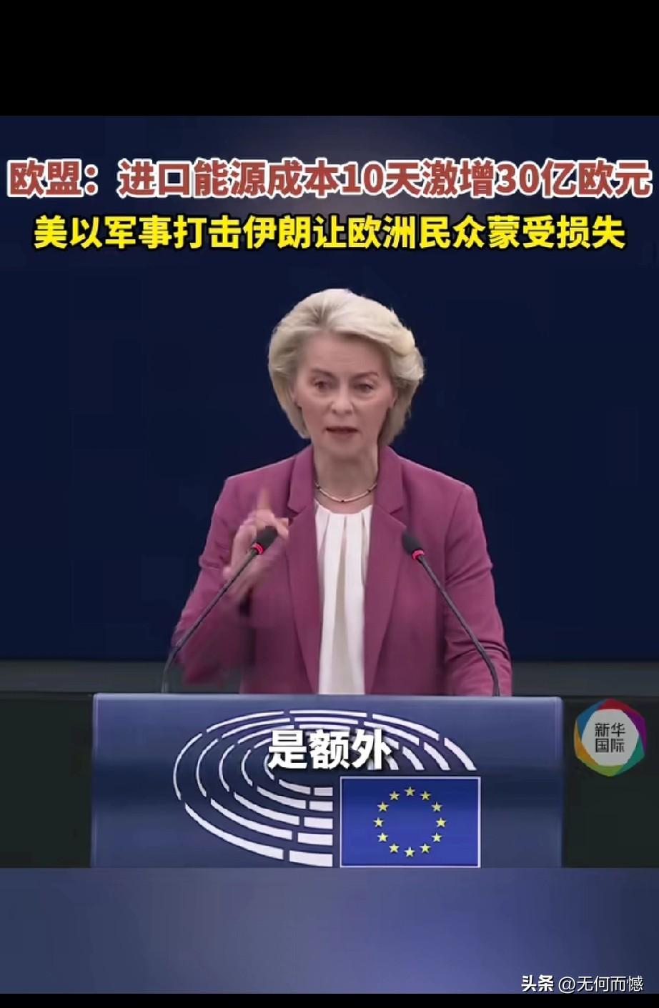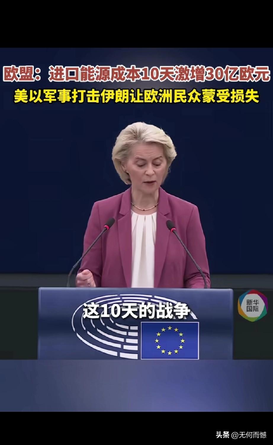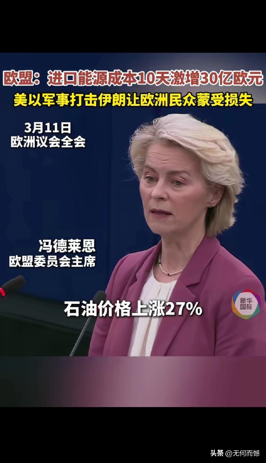 在当地时间3月11日欧洲议会全会上,欧盟委员会主席冯德莱恩公开表示,美国和以色列军事打击伊朗,让欧洲民众蒙受了损失,进口能源成本十天就激增30亿欧元,其中,天然气的价格已上涨50%,石油价格上涨27%,这十天的战争,已经使欧洲纳税人额外增加了约30亿欧元在化石燃料进口方面的支出,是额外!美国发动的伊朗战争,现在对欧洲已经产生了重要的影响,所以说战争的持续进行,这种影响会越来越严重!
