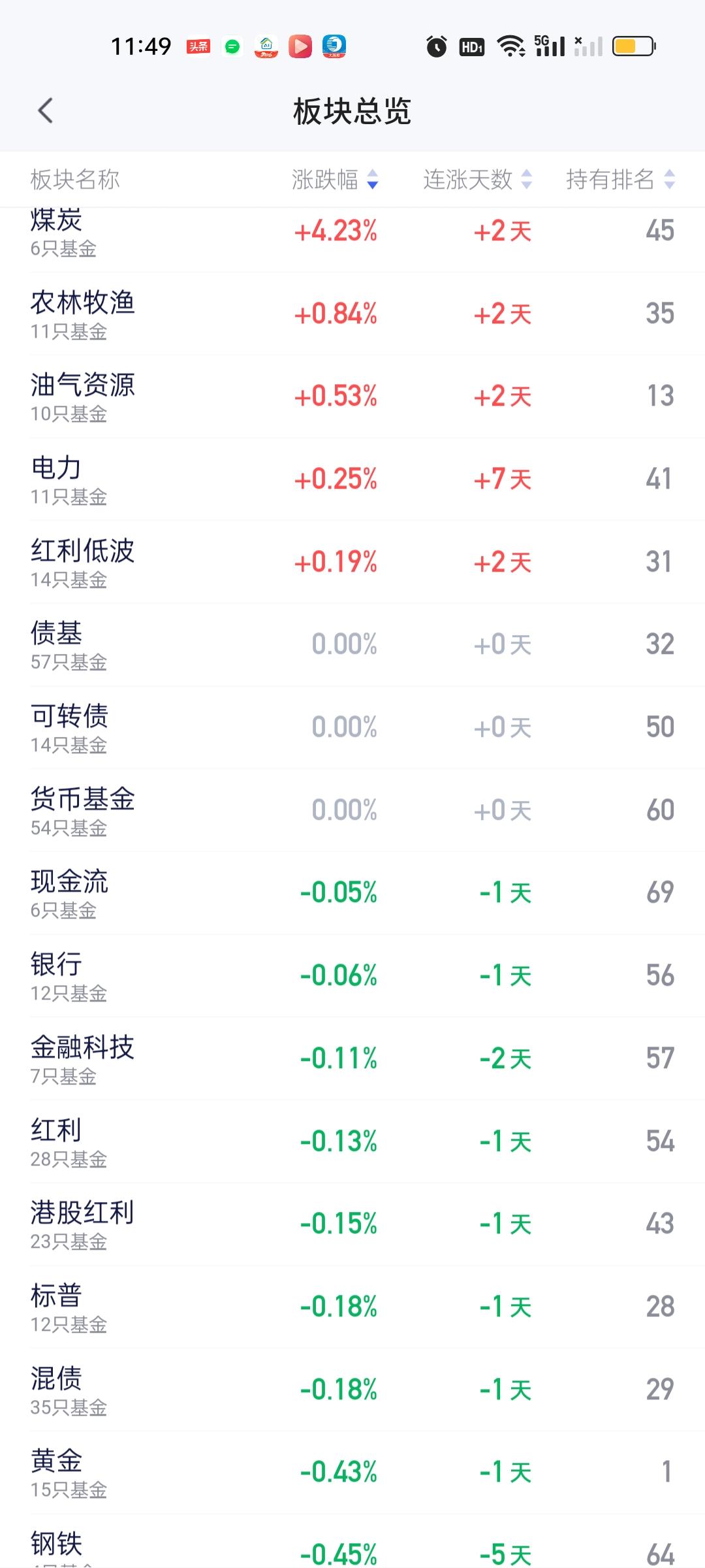 从中午收盘的板块榜来看,上涨的板块非常少,下跌的板块要更多。涨幅靠前的板块是煤炭,农林牧渔,油气资源,电力和红利低波。跌幅居前的有可控核聚变,商业航天,军工,低空经济,稀土永磁,电网设备,CPO,创新药,通信,存储芯片,黄金,半导体材料设备,双创50,半导体,消费电子,人工智能等。